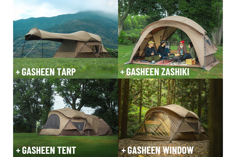 別売りの専用オプション製品を『ガシーンドーム』に「ガシーン」と合体させることで、シェルターの機能と用途を自在に拡張できます。これらのオプションにより、2ルームテントとして家族キャンプ、タープ接続で大人数での宴会リビング、ザシキで快適なお座敷スタイル、そしてクリア窓で雨の日でも閉塞感のない景色を楽しむ「おこもりキャンプ」まで、多様なアレンジが可能です。