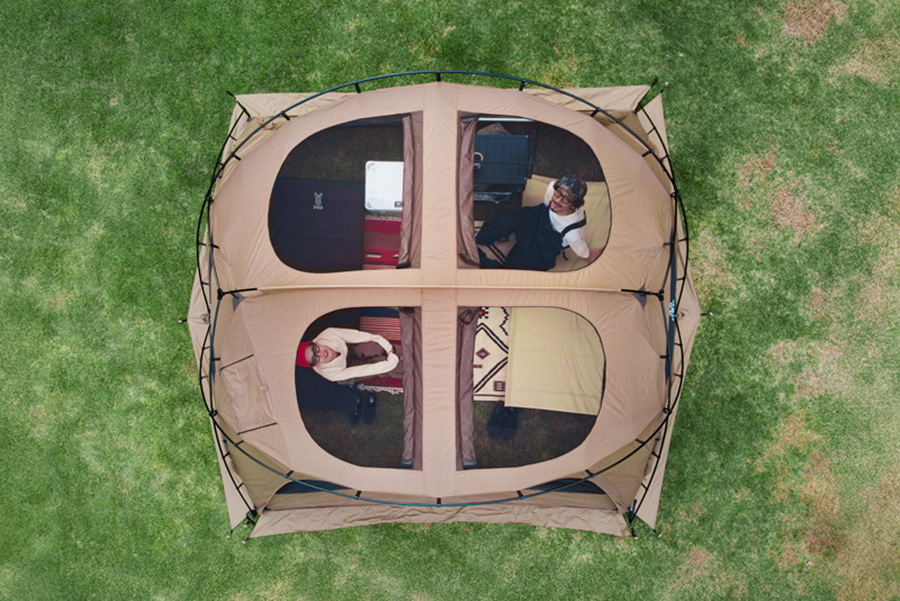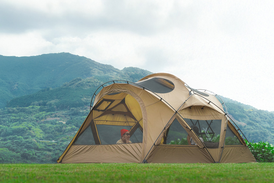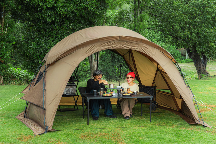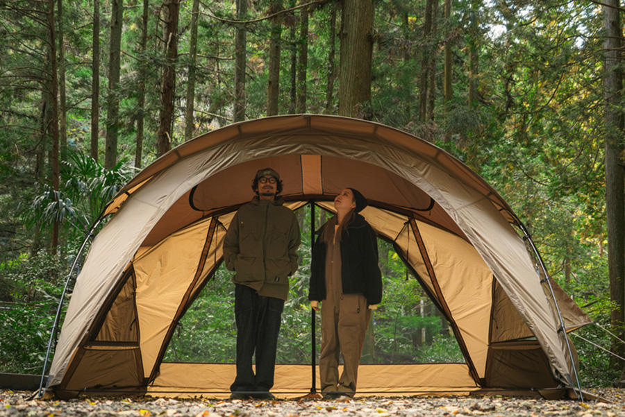 『ガシーンドーム』は、この課題を解決するため、DODとして初の薪ストーブ対応という“冬のコアニーズ”に応えつつ、全面に大きなメッシュを配置することで“夏にも強い”快適性を両立させた、オールシーズン対応の拡張型シェルターです。