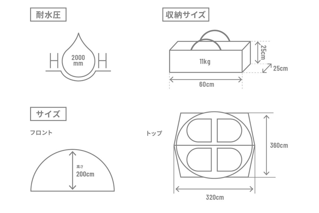 | ガシーンテント | 2ルーム化を実現。ガシーンドームに隙間なく連結可能。設営簡単なワンタッチ構造で、単体でのサンシェード利用も可能。(収容人数:大人5名) | 49,500円 |