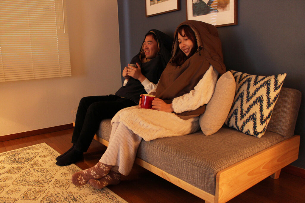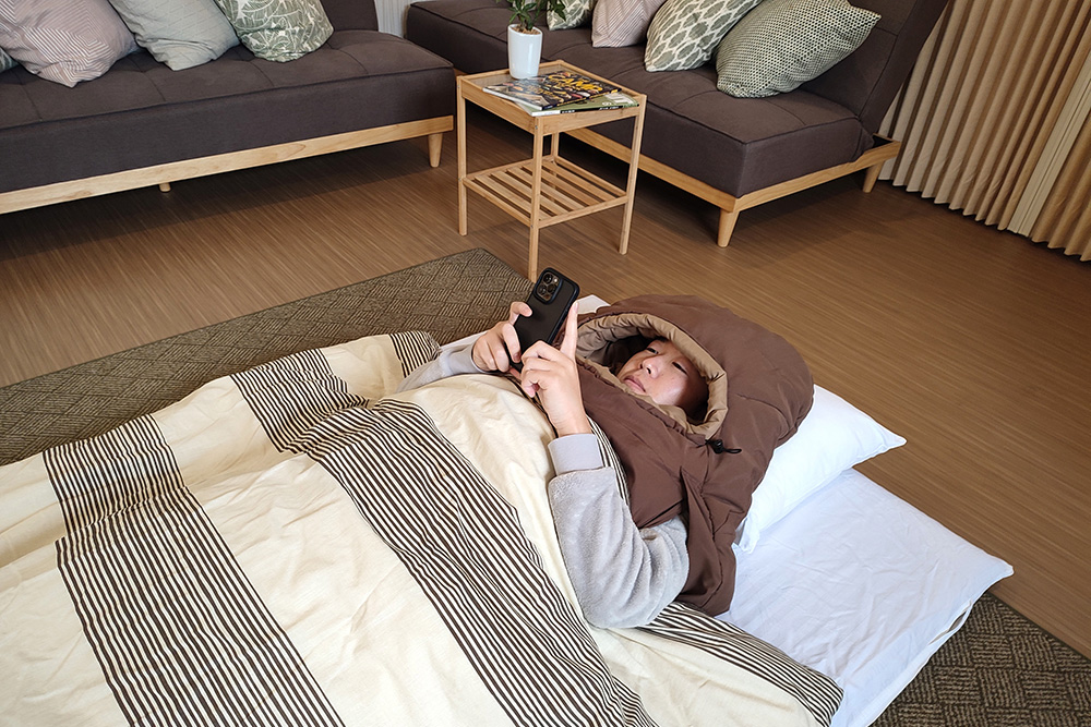 「かぶるん」は、両サイドに手が出せるホールが設けられています。これにより寝る前のスマートフォン操作や読書、夜中にトイレに立つ際にも、温かい「かぶるん」を被ったまま身動きを自由に取ることができます。就寝時だけでなく、リビングでのリラックスタイムや、お子様の勉強時間など、家の中での寒さ対策としても幅広く活用可能です。