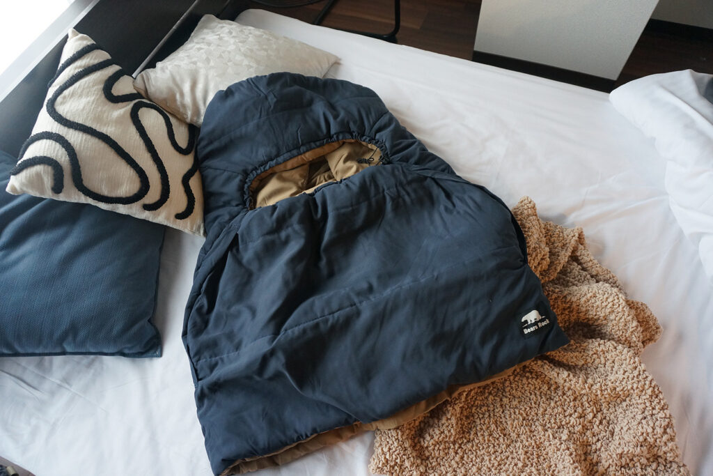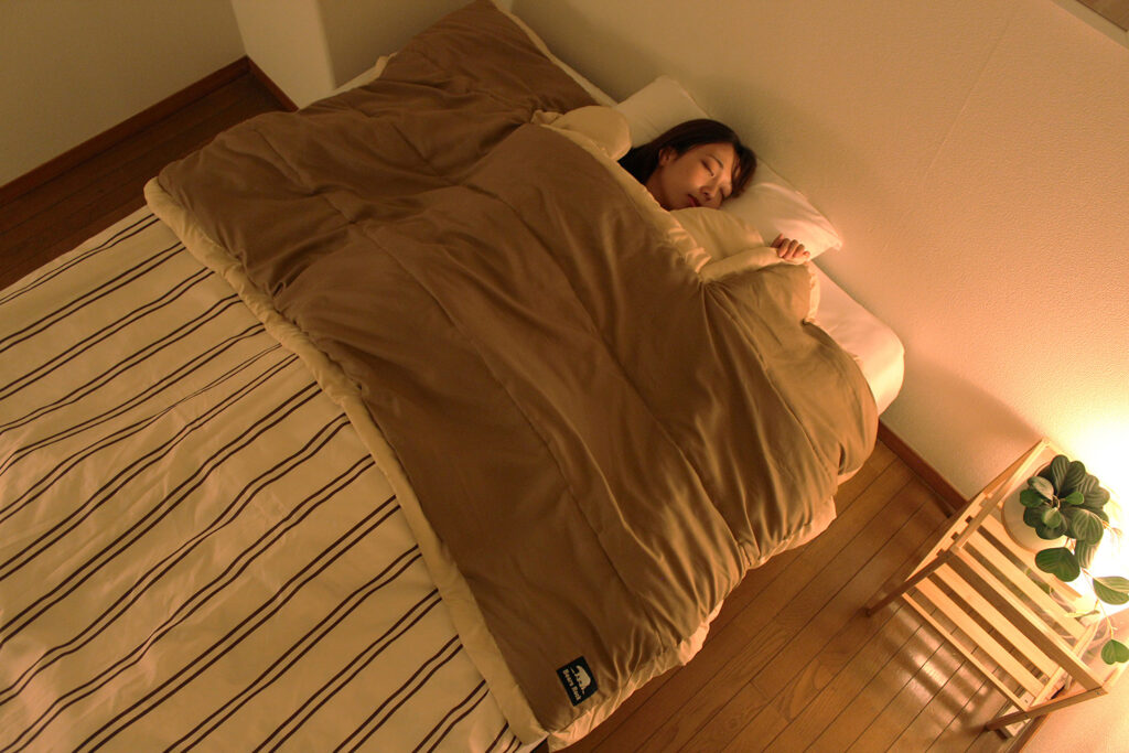 「かぶるん」は、この「布団のすき間」から侵入する冷気をシャットアウトするために誕生。寝袋メーカーであるBears Rockが、その長年のノウハウを結集して開発した「かぶるん」は、まるで寝袋に潜り込むような安心感と温もりを、普段の布団の上で実現します。