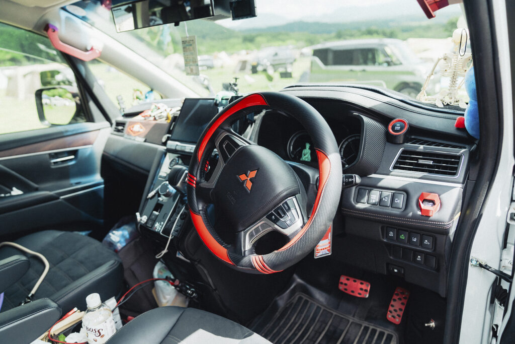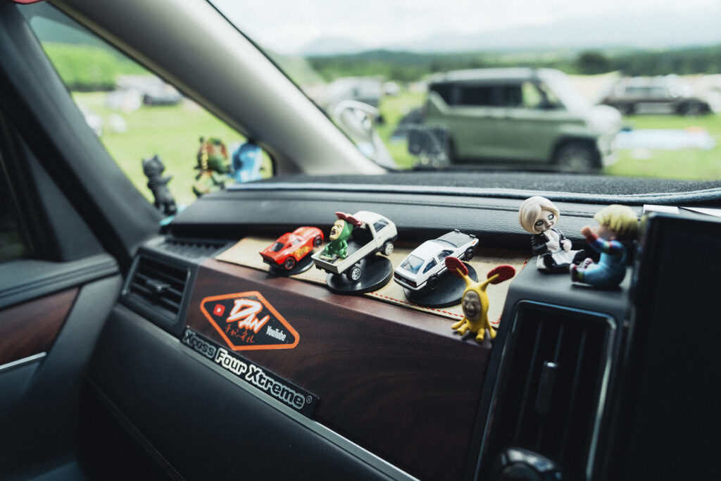 Aピラーのアシストグリップ、足元で存在感を放つペダルも赤で統一。ダッシュボードにはお子さんの趣味でキャラクターのフィギュアが並び、家族みんなでのドライブもにぎやか。今度のさらなるカスタムにも期待したいところです。