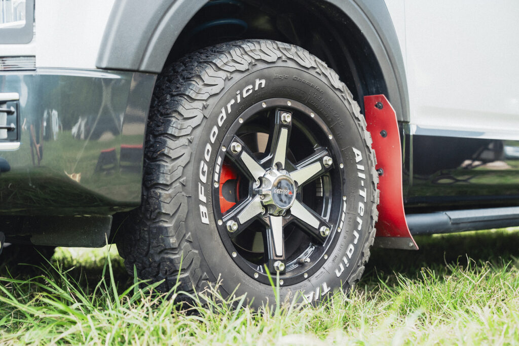 合わせたタイヤは人気のBFグッドリッチ・オールテレーンで、武骨なトレッドパターンとホワイトレターはオフロードタイヤの代名詞といえる。足まわりはオートフラッグスのキットで30ミリリフトアップ。ちなみにブレーキキャリパーは自分でレッドにペイントして、さり気ないワンポイントになっています。