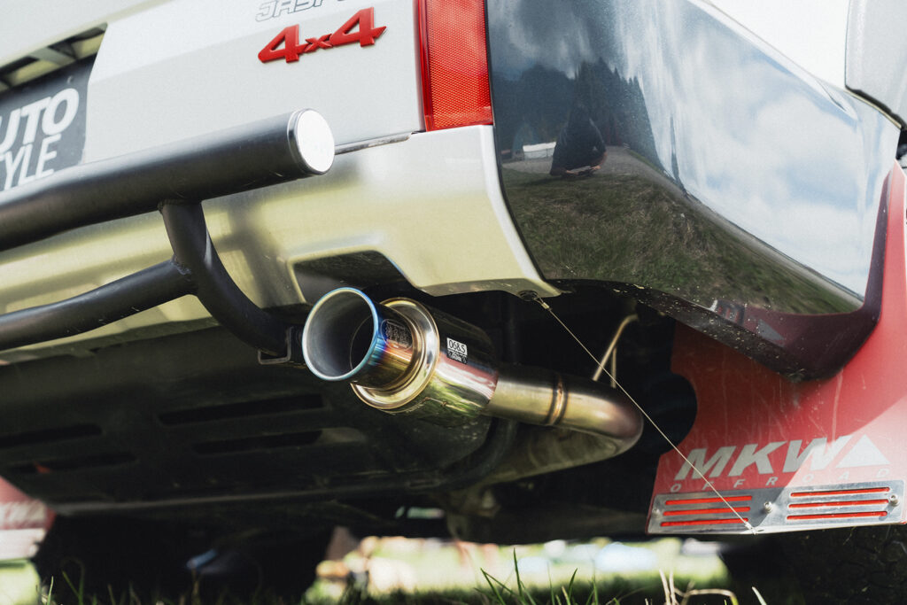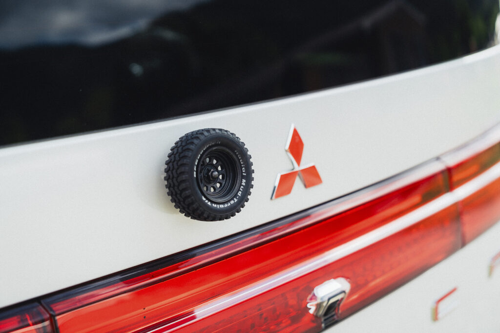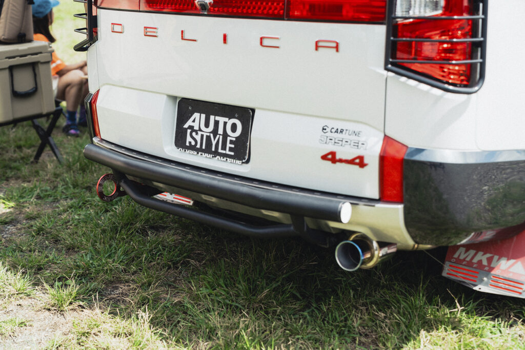 リアまわりのポイントは、極太パイプを採用した輝オートのリアバンパーガードとテールランプガード。デリカD:5をよりたくましいオフロードスタイルへと導くアイテム。マフラーはテールエンドにグラデーションの焼き色が入った柿本改を選び、スポーティな雰囲気もプラス。