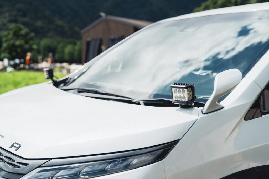 外装はホワイトとブラックでメリハリを効かせ、さらに差し色として赤を加えることでオリジナリティを表現。フロントまわりのポイントはオートフラッグス製のフロントバンパーガード。純正バンパーの形状に沿って曲げ加工が施されたパイプは一体感があり、バンパーに違和感なく馴染みます以前はシルバーカラーを装着していたが、ブラックに変更したことでまとまり感を向上。ヘッドライトガードやグリルマーカーも、ワイルドなムードを添えます。