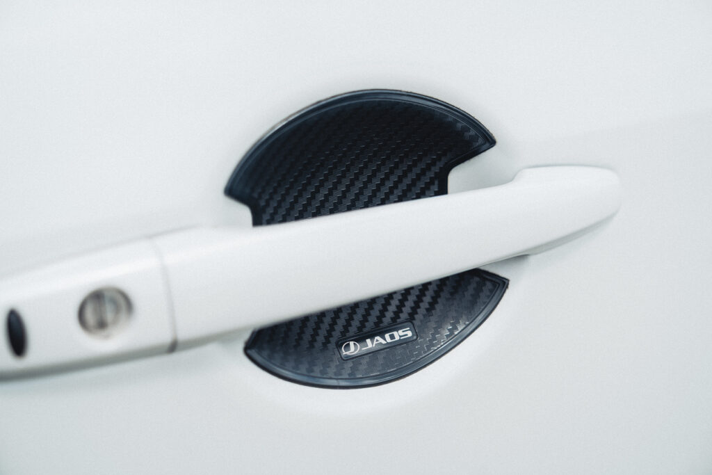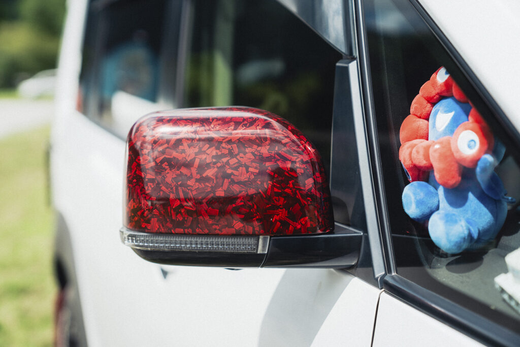 例えばドアミラーはクラッシュカーボン柄のシートでラッピング。数あるカーボン柄の中でも細かいカーボン繊維を集めたクラッシュカーボンは最近のトレンド。しかも定番のブラックではなくレッドのシートを使っているので華やかさが段違い。最近のラッピングシートは張りやすく、仕上がりも上々です。