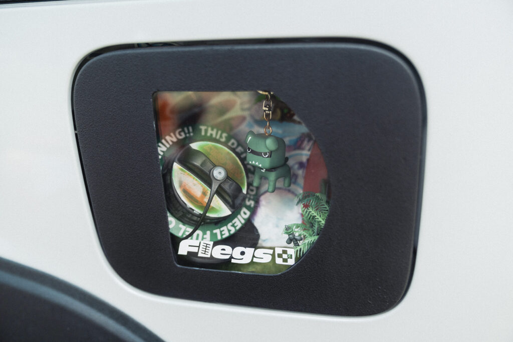フューエルリッドの裏側にガラスを張って内部を見せるというワンポイントカスタムも、あらゆるジャンルで流行している小ネタ。チッピング風のマットブラックで塗装して引き締めつつ、奥にはサーフボードやヤシの木のフィギュアを飾っていて何ともトロピカルな雰囲気。