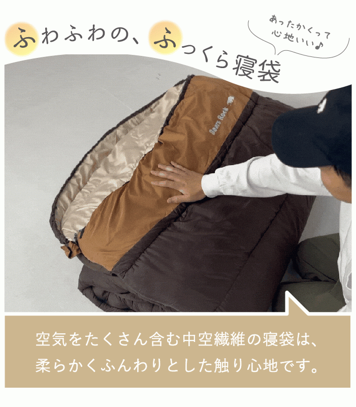 また、表面生地はBears Rockシリーズで最高峰のものを使っており、触ってみるとふわふわとしてやわらかい質感が特徴です。内部のBRウォーム®と相まって、極上の心地よさと保温力を生み出しています。それにより、独自のBRウォーム®機能が熱をしっかりと保持し、一晩中ぬくもりが持続。冷え込みが厳しい季節でも、朝まで心地よく眠れる高い保温性能を誇ります。