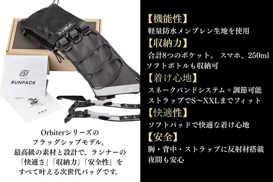 「XEN Orbiter」は、従来のランニングギアの概念を打ち破るハイブリッドな製品です。高い収納力と機動性を両立しながらも、驚くほど軽く、体の動きを一切制限しない設計が特徴です。本製品は、以下のメリットを融合させた独自構造を採用。
