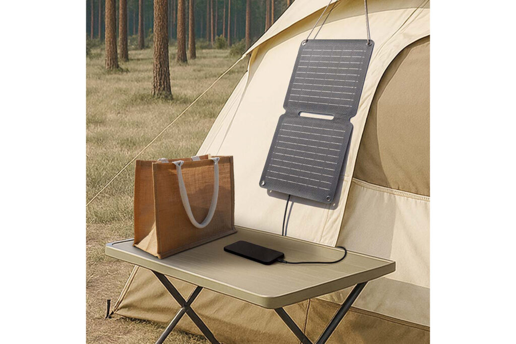 太陽の光を電力に変えて、スマートフォンなどのUSB機器を充電できるポータブルソーラーパネル充電器です。アウトドアや災害時など電源がない場所でも太陽光があれば使用できます。
