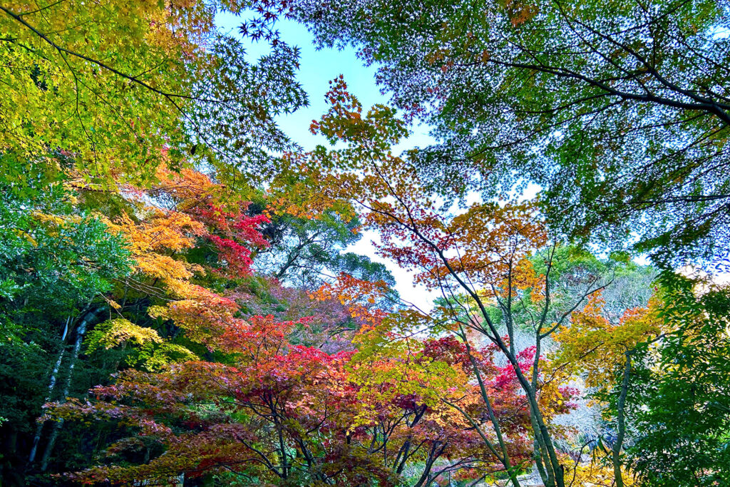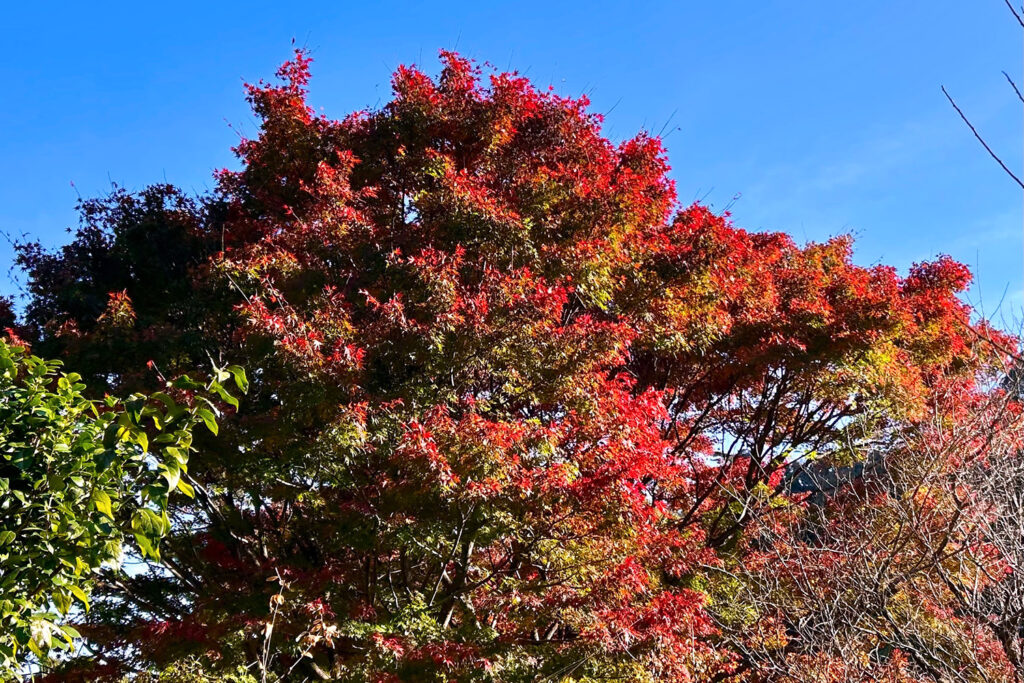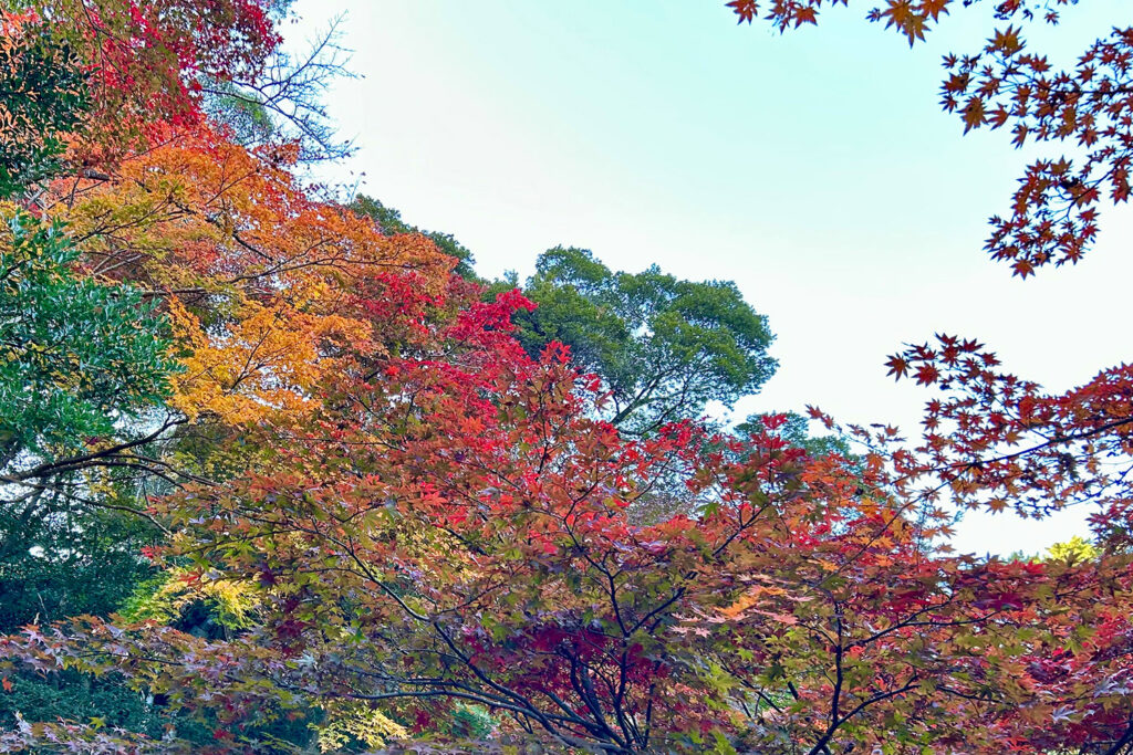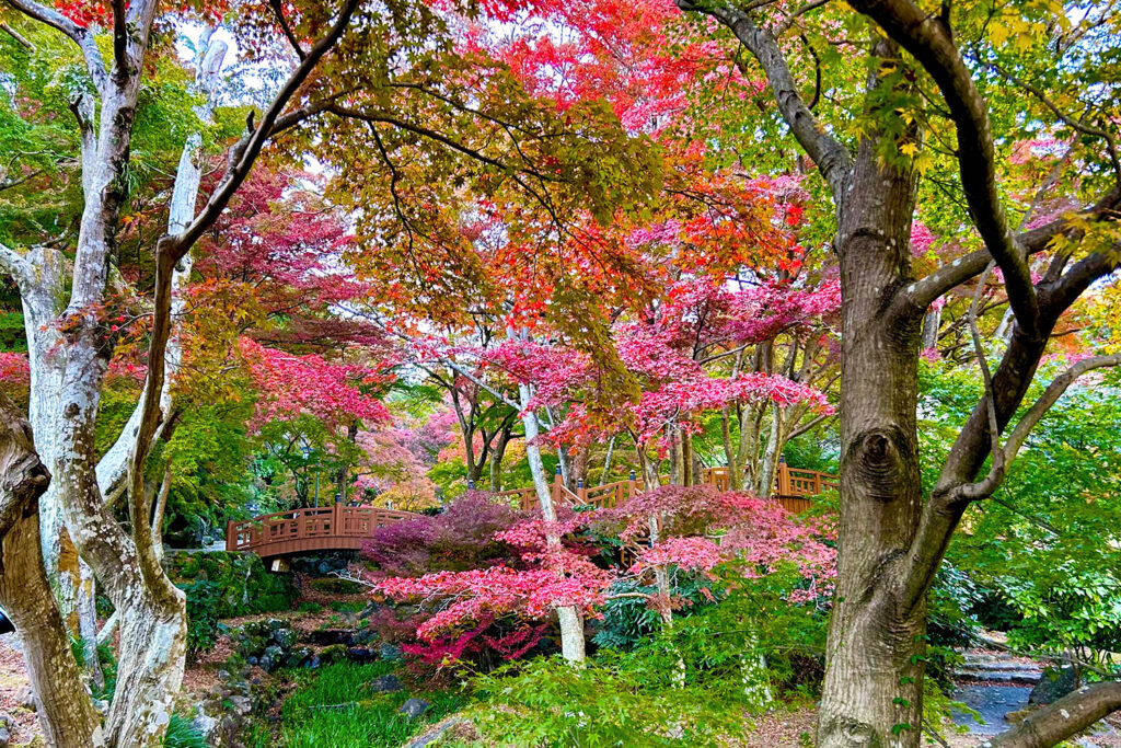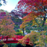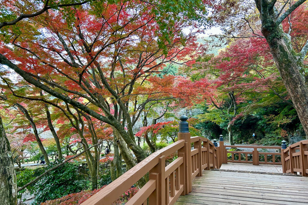 朱塗りの橋と真紅のもみじが鮮やかです。訪れた時はまだ緑のもみじも多く、しばらく紅葉が楽しめそうでした。12月7日の日曜日まではもみじのライトアップ(16時30分〜21時)も見ることができます。