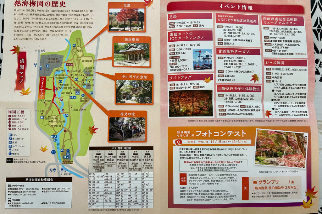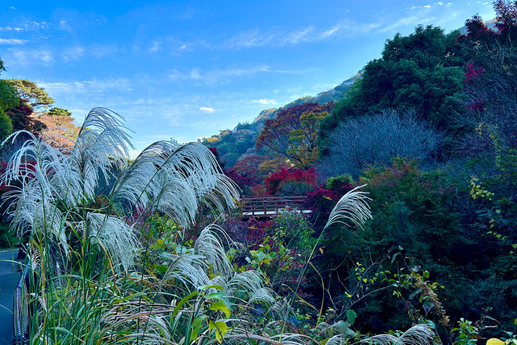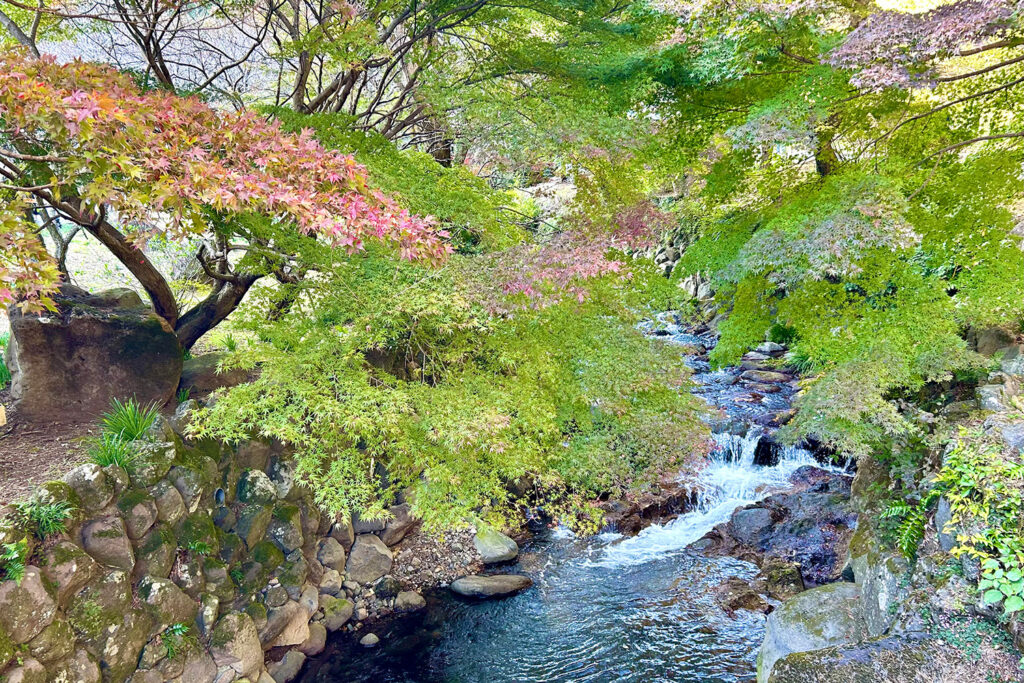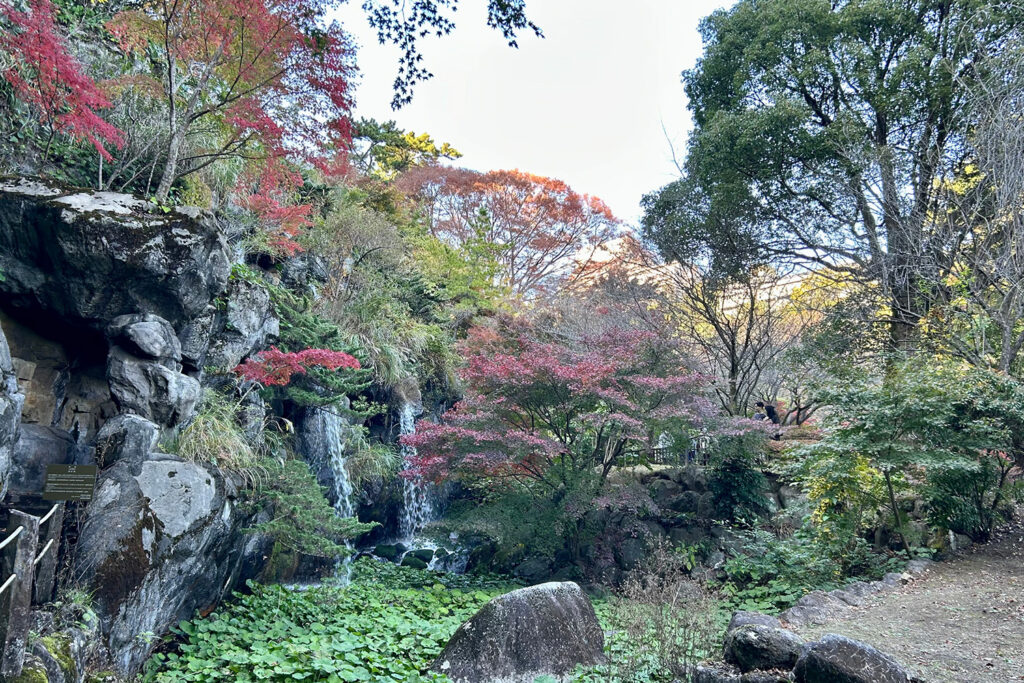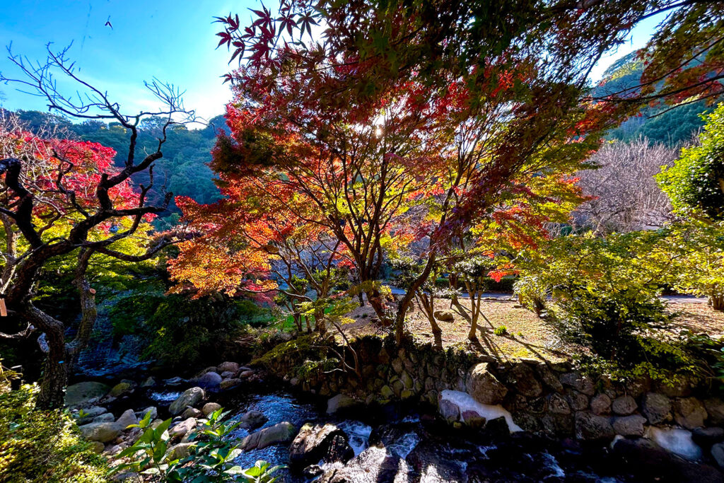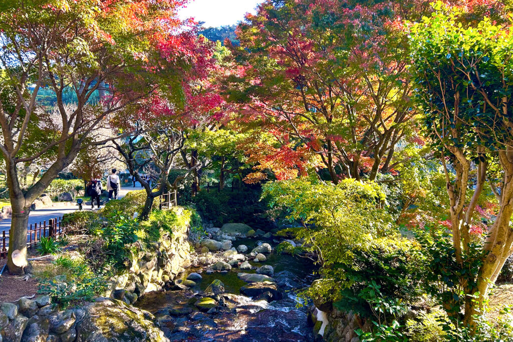 今では日本一早い早咲きの梅と日本でもっとも遅い紅葉が楽しめる庭園は1886年に完成しました。梅と楓・松・桜・桃・杉・柿・柳など3000本余りを植栽。起伏に富んだ景色のよい場所にあって園内を流れる清流は清く、趣のある岩もたくさん配して、山水花木、四季の眺めも美しくなったといいます。熱海梅園は11月15日〜12月7日までもみじまつりが開かれています。