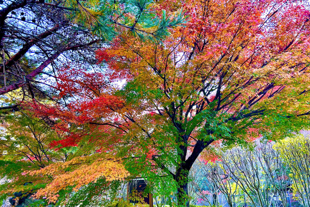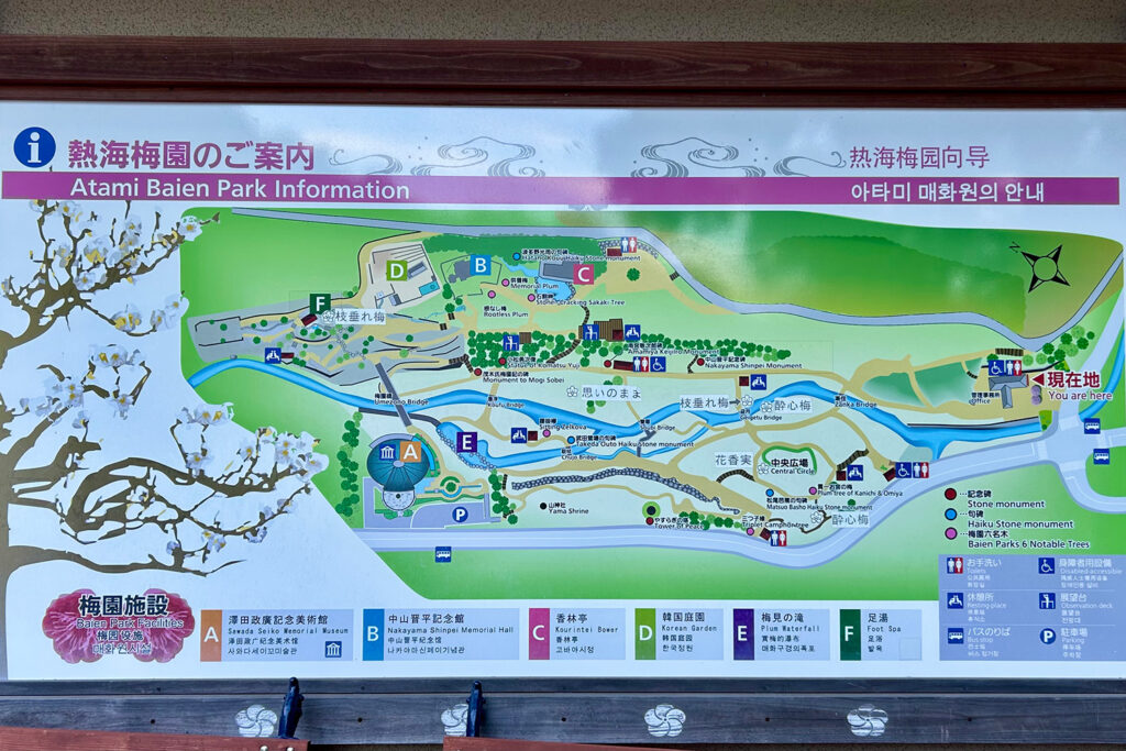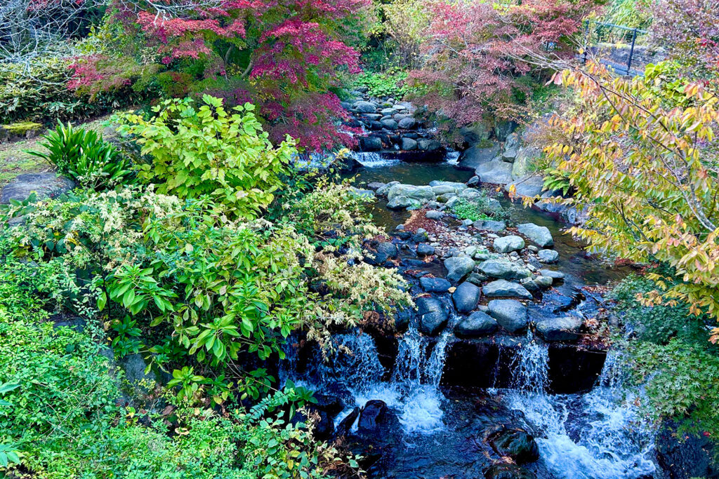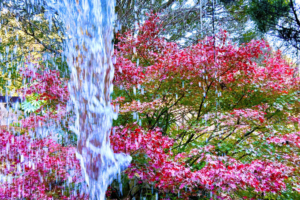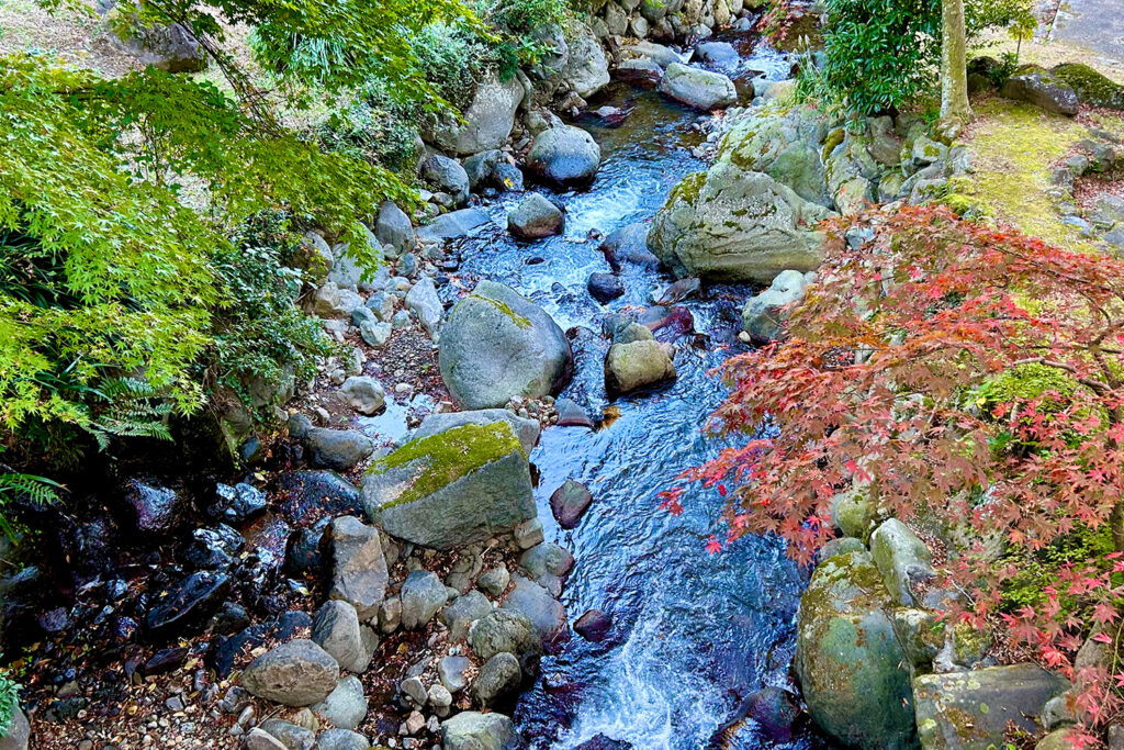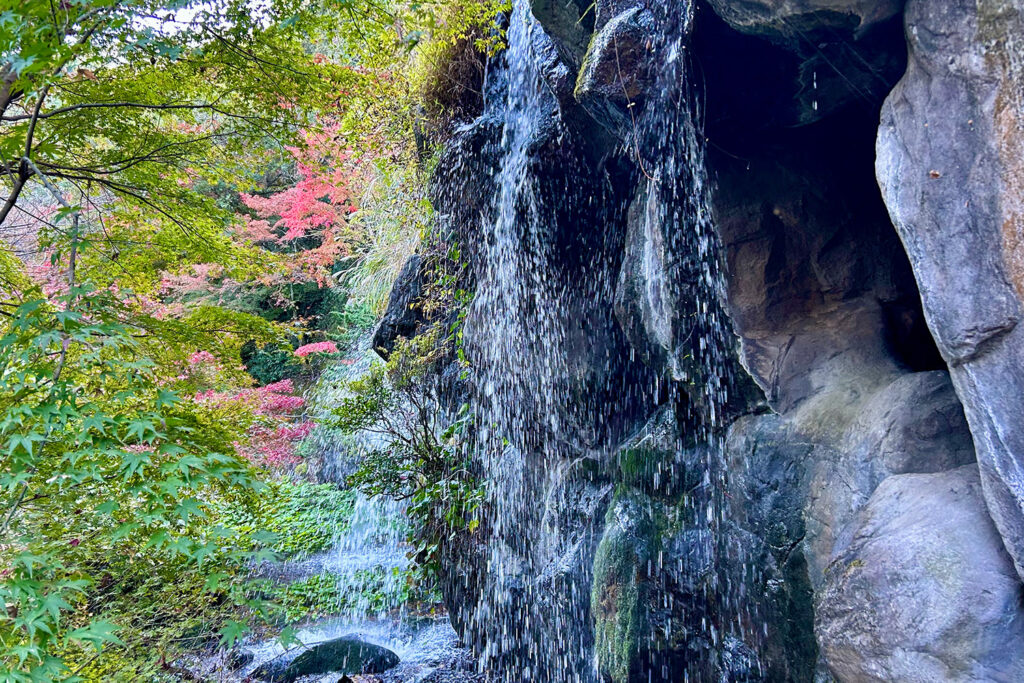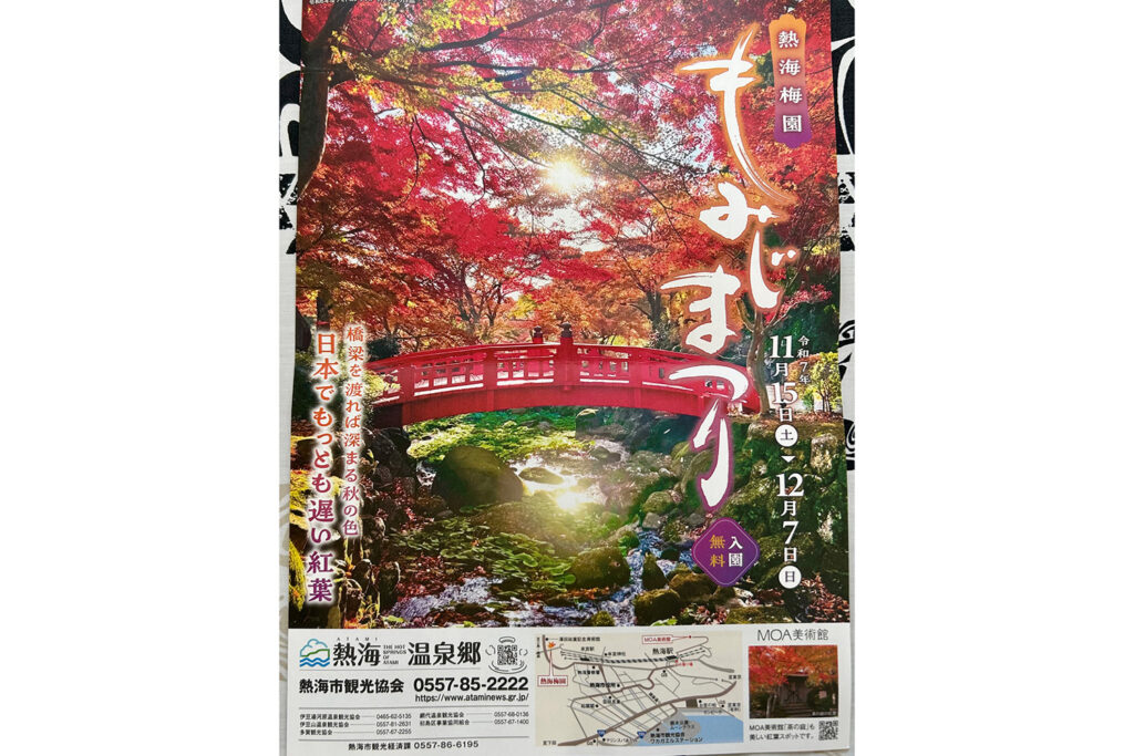 今では日本一早い早咲きの梅と日本でもっとも遅い紅葉が楽しめる庭園は1886年に完成しました。梅と楓・松・桜・桃・杉・柿・柳など3000本余りを植栽。起伏に富んだ景色のよい場所にあって園内を流れる清流は清く、趣のある岩もたくさん配して、山水花木、四季の眺めも美しくなったといいます。熱海梅園は11月15日〜12月7日までもみじまつりが開かれています。
