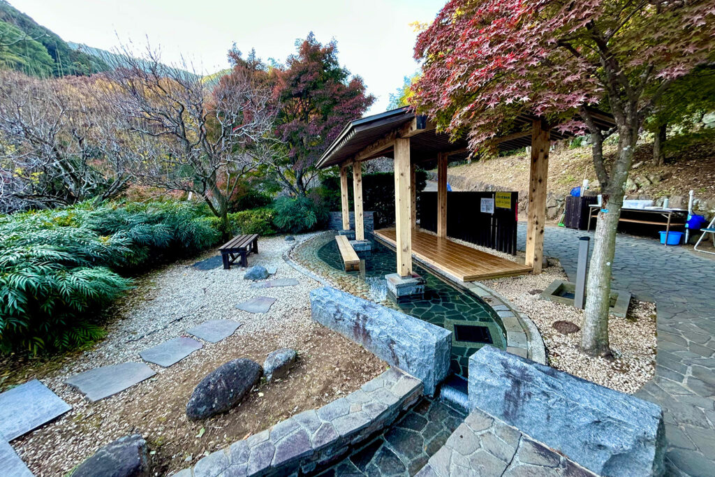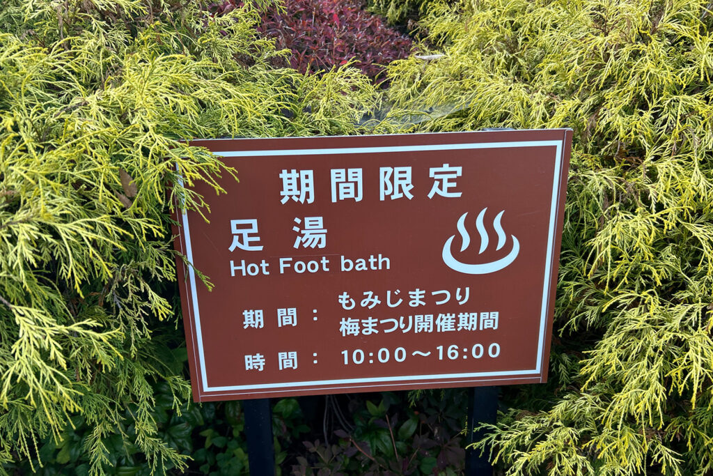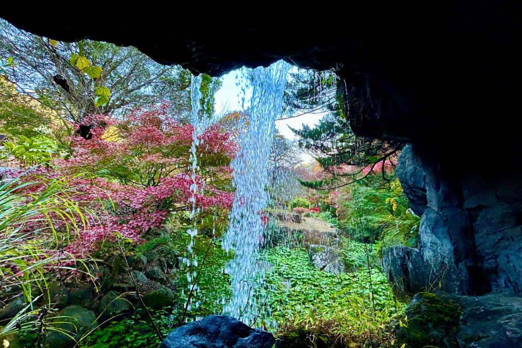 梅園の奥には梅見の滝があります。今はもみじ見の滝です。滝の裏側に行けるように洞窟が用意されていて滝から流れ落ちる水飛沫越しに紅葉が楽しめました。もみじまつり開園中(10時〜16時)は足湯にも入れます。梅園の一番奥にあって気持ちのいいお湯です。さすが名湯の熱海ならではですね。