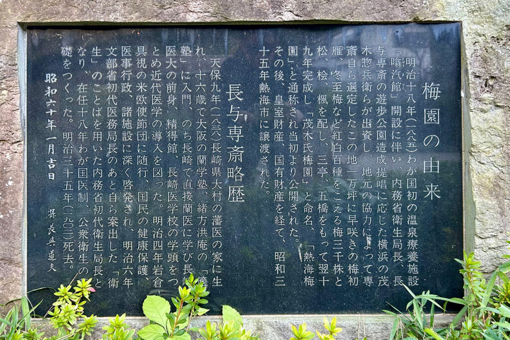 茂木氏梅園記によると明治18年(1885年)4月に岩倉具視大臣の命令を受けて噏海館を落成した当時内務省の衛生局長だった長与専斎さんが提唱し、横浜の豪商・茂木さんに協力してもらって出来上がったのが熱海梅園だそうです。