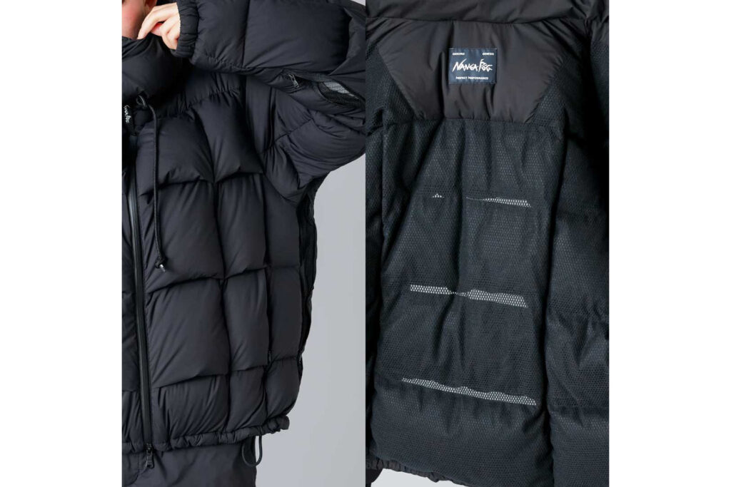 NANGAの代表製品である寝袋の特性に着目し、これまでにない快適な着心地を実現。「ボックスキルト構造」を採用することで、軽量・保温性と通気性を両立。また、熱がこもりやすい身頃部分をダウンパック状に設計し、メッシュ素材とすることで通気性を確保。アームから脇の下を通るトリプルファスナーによるベンチレーション機能により、撥水・防風・ストレッチ性に優れた素材を採用。