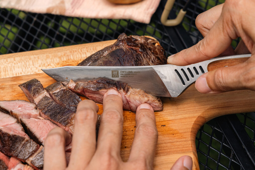 ナイフの心臓部である刃付けは、ツヴィリングの職人が一本一本手作業で施しています。厳しいアウトドア環境での料理に最適化するため、刃の角度を通常のキッチンナイフより鈍角の約35度に調整。この角度は、硬いカボチャや根菜類、あるいは肉の骨周りなど、負荷のかかる食材を切る際に、刃こぼれしにくく、安定した性能を発揮するように設計されています。ツヴィリングの伝統と最新の知見が融合した、「レイザーエッジ」の切れ味をアウトドアでも実感いただけます。