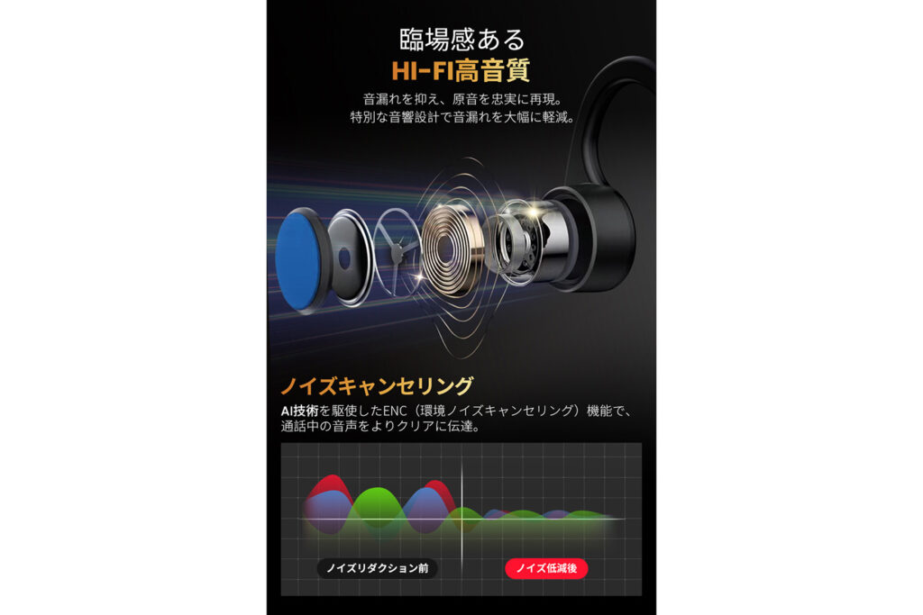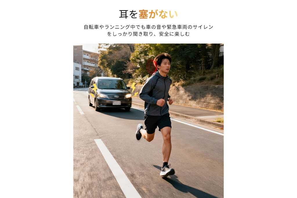 耳孔をふさがないため、車の走行音、歩行者の声、信号のアナウンスなどを自然に把握できます。自転車通勤や通学路、ランニング中の安全性を確保しながら、音楽・通話をストレスなく楽しめます。