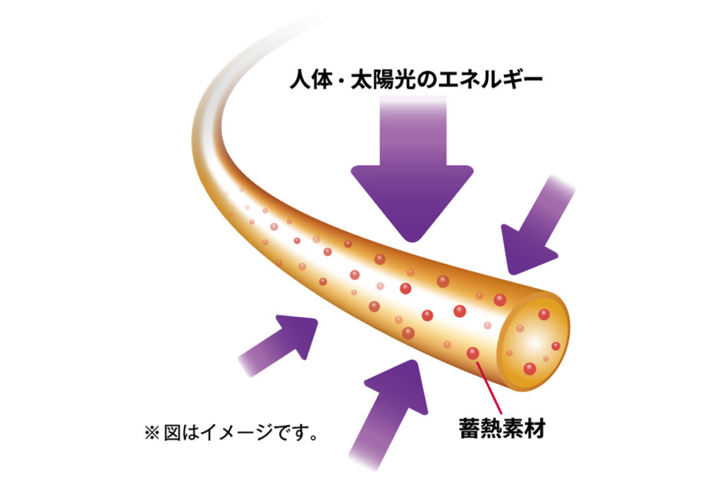 コア技術となるのは、ポリエステル糸に蓄熱粉末素材を練り込んだ特殊な繊維です。人体や環境から放出される遠赤外線などのエネルギーを効率よく吸収し、熱として繊維内に蓄えます。