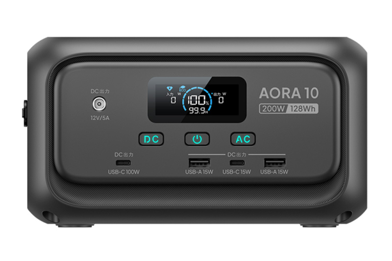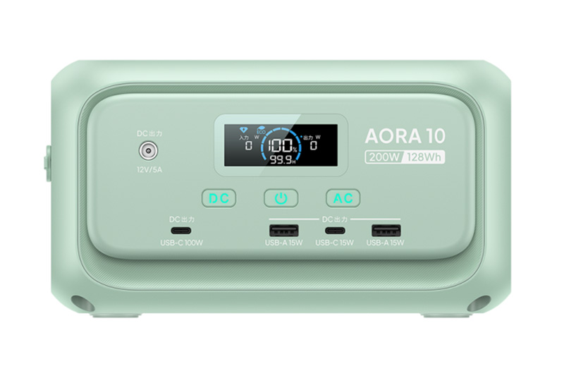 そこで「AORA 10」は、これらの声に応えるべく開発され、わずか1.8kgの軽量設計ながらAC出力およびUSB-C(100W)を含む合計6ポートを搭載し、スマートフォン、ノートPC、小型家電まで安心して使用できる超コンパクトボディに本格電源を搭載した一台です。