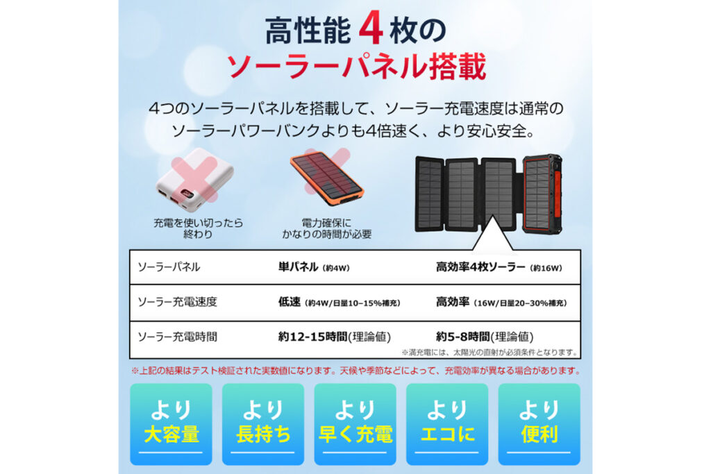 2025年モデル最大の特徴は、コンセント充電に依存しない、極めて高い電力自給能力にあります。広範囲に配置された4枚の大型ソーラーパネルは、日中の太陽光を効率的に捉え、本体バッテリーに充電します。これは、一般的なソーラー充電器と比較して大幅に充電効率を向上させており、長期間の停電が予測される状況下でも、継続的に電力を確保するための重要な手段となります。