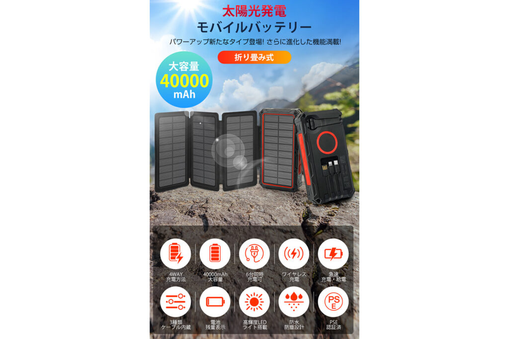 本製品は、大容量40000mAhのバッテリーに加え、4枚の大型ソーラーパネルと手回し発電機能を組み合わせた3WAY充電に対応。さらに、最大6台同時充電、タイプCケーブル内蔵、ワイヤレス充電、そして高輝度LEDライトなど、防災・アウトドアシーンで求められる機能を一台に集約した“オールインワン”モデルの決定版です。