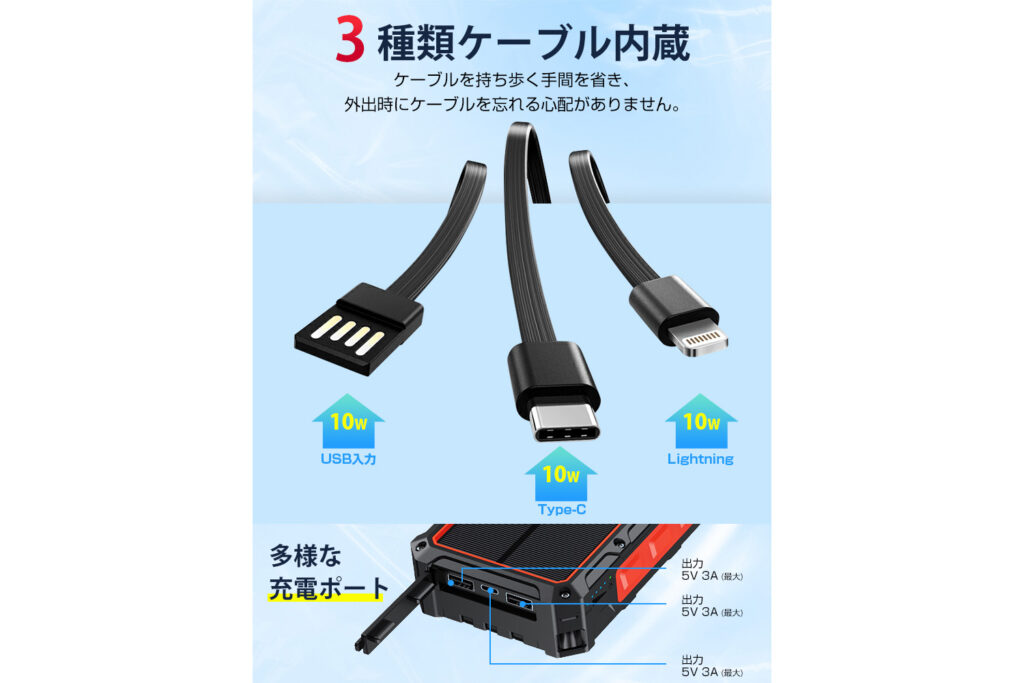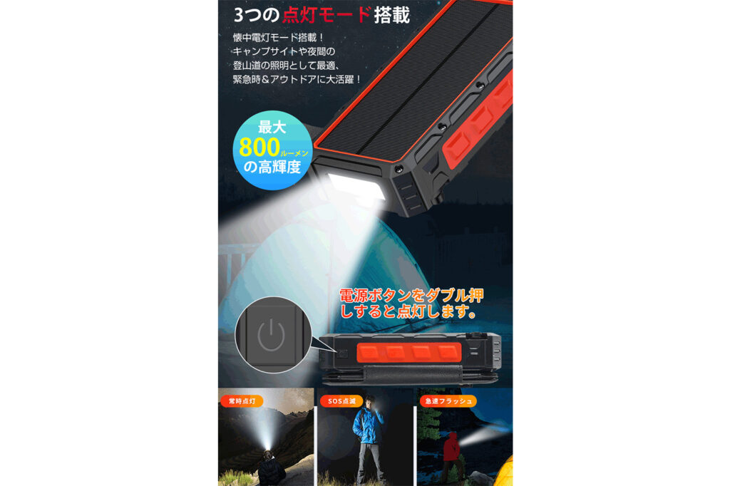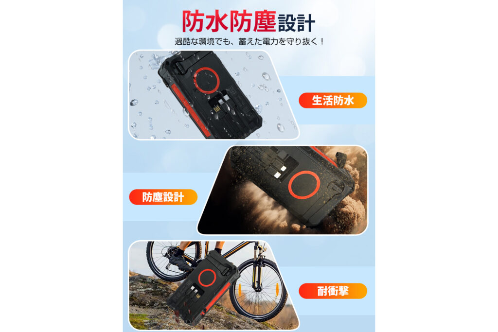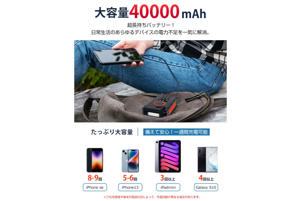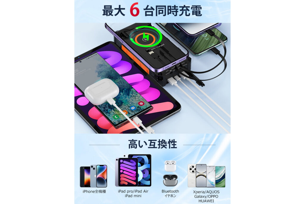 本製品は、大容量40000mAhのバッテリーに加え、4枚の大型ソーラーパネルと手回し発電機能を組み合わせた3WAY充電に対応。さらに、最大6台同時充電、タイプCケーブル内蔵、ワイヤレス充電、そして高輝度LEDライトなど、防災・アウトドアシーンで求められる機能を一台に集約した“オールインワン”モデルの決定版です。