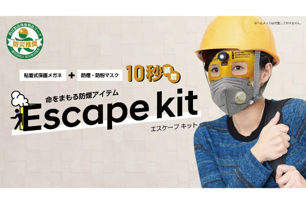 初期消火活動を行う際や、火災発生時に安全に避難するためのアイテムをパッケージ化したのが「エスケープキット」です。「粘着式保護メガネ」と「高性能防煙・防粉マスク」が同梱され、火災による有毒ガスや煙、さらには消火器の粉末消火剤の吸引から、目と呼吸器を確実に保護します。