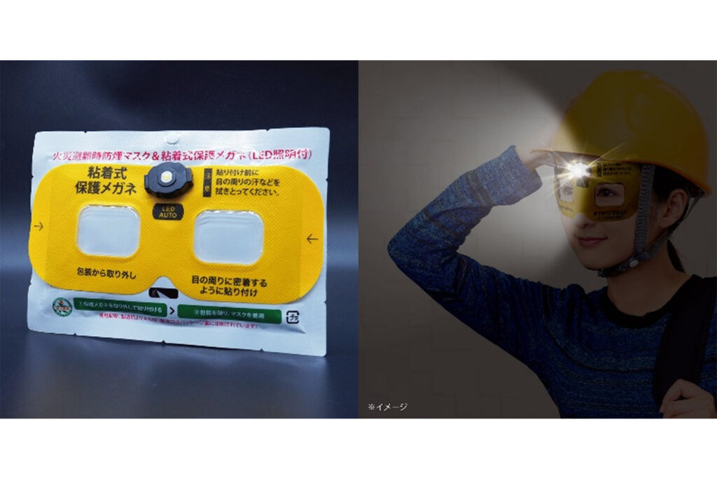 また、粘着式保護メガネは、肌荒れを起こしにくい素材を使用し、誰でも素早く簡単に装着が可能。さらにフィルムを剥がすと、自動で点灯するLEDライト付きで停電時や煙による視界不良の中でも安全に退路を確保することができます。なお、煙遮断性能は最大99.82%を誇り、多層機能性6層湿式複合フィルタリングマスクを採用。産業用防塵マスク1級基準のガス遮断率も備え、消火活動中の粉末吸引や有毒ガスから身を守ります。
