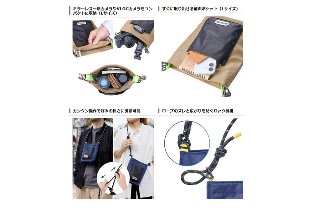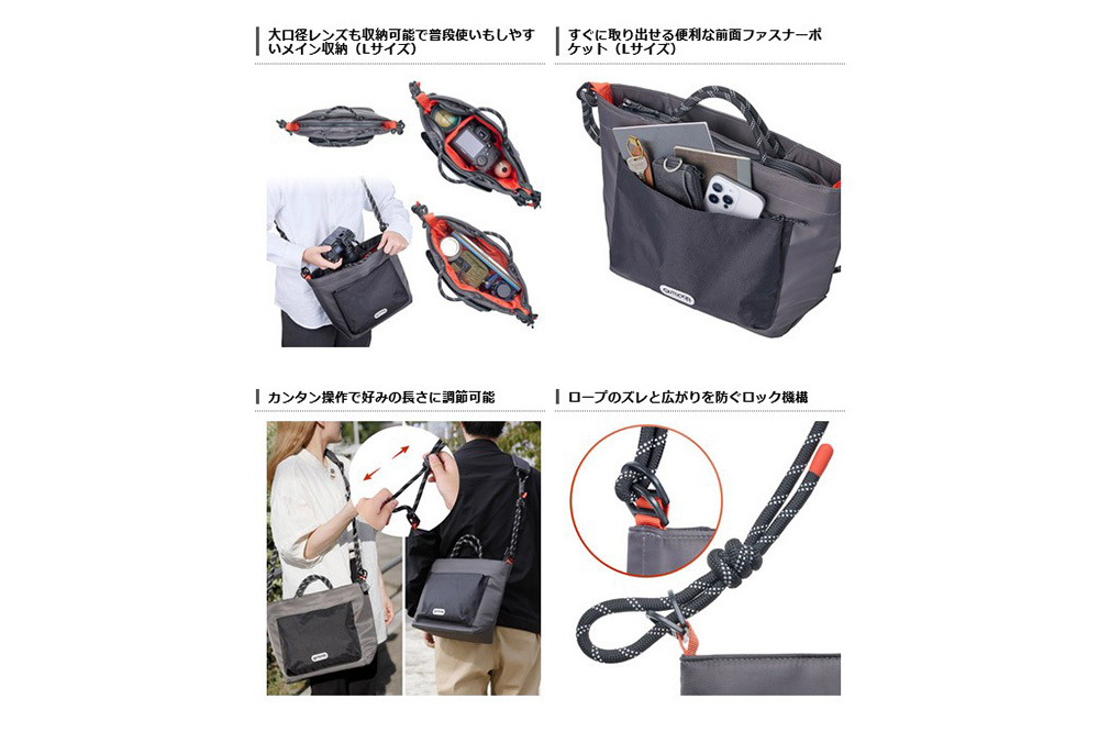 「ロープ カメラミニショルダーバッグ」は、カメラだけではなく普段使いの小物入れとしても機能する、機動性の高いコンパクトなショルダーバッグです。開口部には、片手でカンタンに開閉できるマグネットロックを装備。シャッターチャンスを逃さない素早いアクセスを可能にするとともに、セキュリティ性も確保。