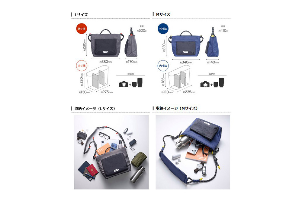 「ロープ カメラショルダーバッグ」は、本格的なミラーレス一眼カメラと交換レンズを携行したいユーザーに向けた、十分な容量を確保したショルダーバッグです。レンズを装着したミラーレス一眼カメラ本体に加え、70-200mm F2.8クラスの望遠交換レンズも収納可能な大容量設計を採用。