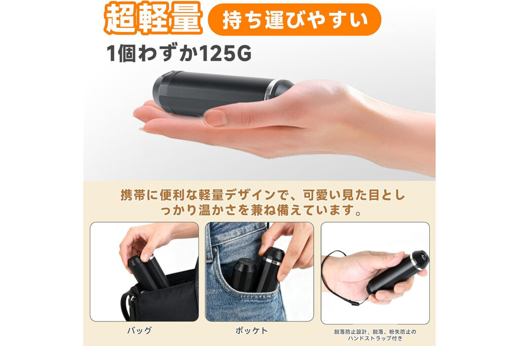 高性能でありながら、その携帯性と安全設計にも徹底的にこだわっています。コンパクトサイズ(約110×58×29mm)で、重量は1台あたりわずか約125gと、卵よりも軽い設計です。ポケットや小さなハンドバッグにもすっきり収納でき、持ち運びの負担になりません。さらに、磁石でバッグ内にピタリと固定できるため、カバンの中で迷子になったり、紛失したりするリスクも軽減できます。