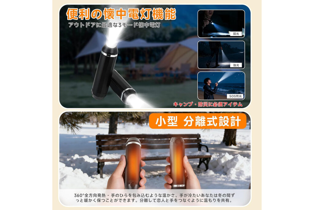 とくに革新的なのが、磁石による結合・分離設計と、360°全面発熱を実現した棒状デザインです。一台で極上の温もりを提供し、分離すれば大切な人と温もりを共有できる新発想のハンドウォーマーは、日常の通勤通学から本格的なアウトドア、さらには防災備蓄まで、あらゆるシーンでの活躍が期待されます。