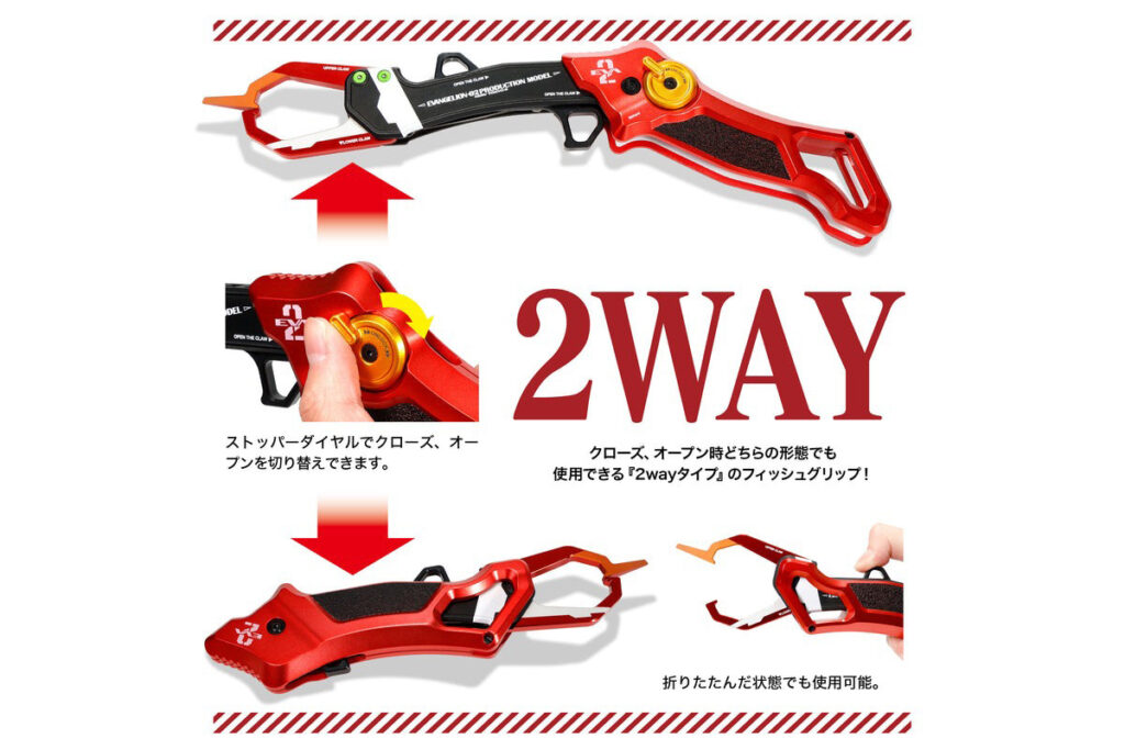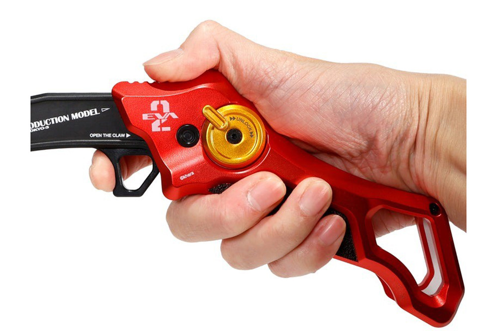 DRESSを代表する高性能フィッシュグリップ「グラスパー グラディウス 2.0」に、エヴァンゲリオン2号機のデザインを大胆に落とし込みました。先端に角を装備したクローは、閉じた魚の口でもガッツリと掴める設計。シーバスのほか、青物や大型魚をターゲットにするアングラーにも最適です。