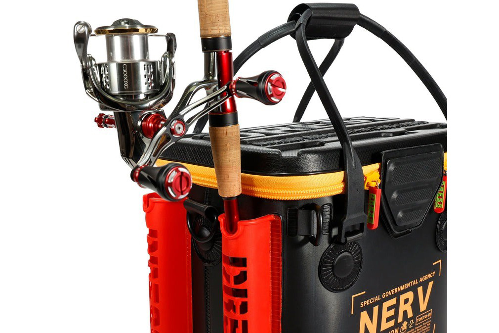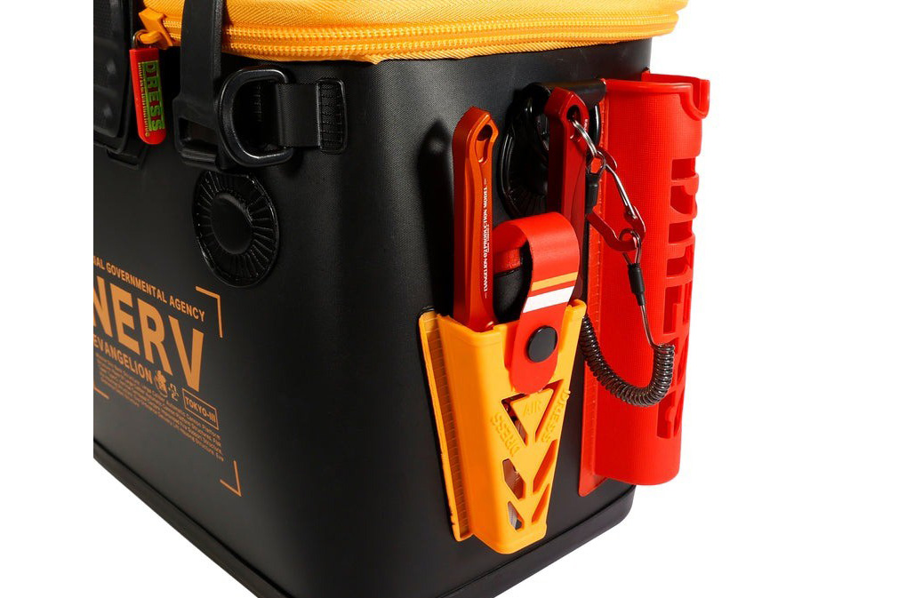 エヴァンゲリオン2号機のテーマカラーと「NERV」ロゴをあしらった限定デザインのタックルバッグ。ロッドホルダー3本とプライヤーホルダー付きで、収納性も抜群。丸洗い可能なEVA素材と高耐久TPUショルダーベルトを採用し、機能性と耐久性を兼ね備えた万能バッグです。