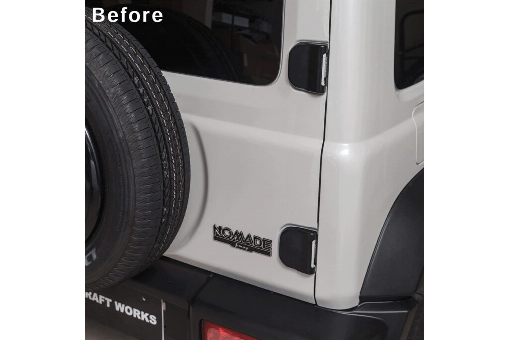 スズキセーフティサポート装着車、オートマ(AT)、マニュアル(MT)車ともに対応。ただし、本製品はリアゲート右側専用となる点にご注意ください。最新の5ドアモデル(ノマド)にも対応しているため、幅広いユーザーにご利用いただけます。