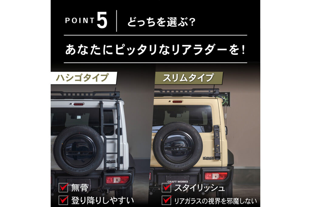 本製品は、ルーフキャリアへのアクセス性向上という実用的な機能に加え、「リアビューをスタイリッシュにカスタムしたい」というユーザーの要望に応えるデザイン性を追求。軽量で高剛性の構造、そして車体への穴あけ不要な強固な取り付け構造を採用することで、最新のジムニーノマドモデルを含む幅広いユーザーに、アウトドアから日常利用まで、快適で安全なカーライフを提供します。