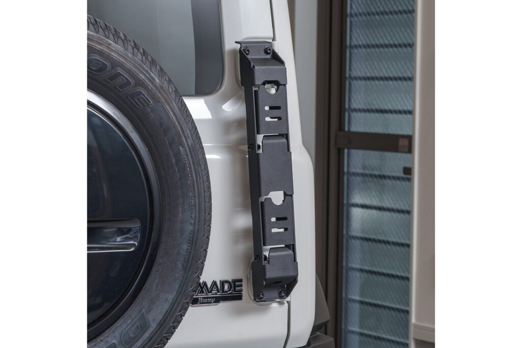 CRAFTWORKSが提案する「スリムタイプ」は、従来のハシゴ型リアラダーの無骨な印象を一新し、ジムニーの持つ美しさを引き立てる洗練されたスタイルが最大の特長です。スリムに設計された本体は、リアゲートに装着されても目立ちすぎず、ジムニーのタフなデザインを損なうことなく、モダンなアクセントを加えます。従来のラダーに比べ、リアガラスの視界を邪魔しにくい設計となっており、安全運転にも配慮されています。