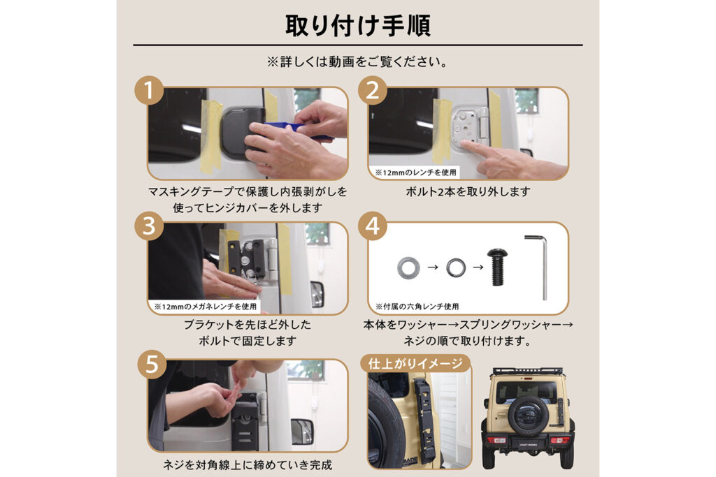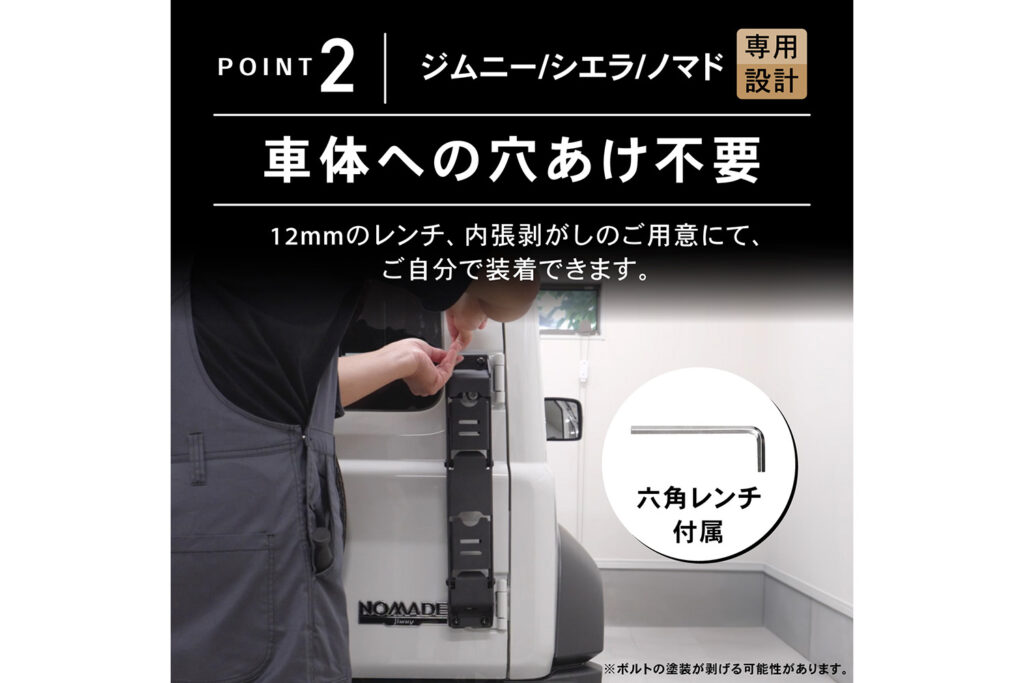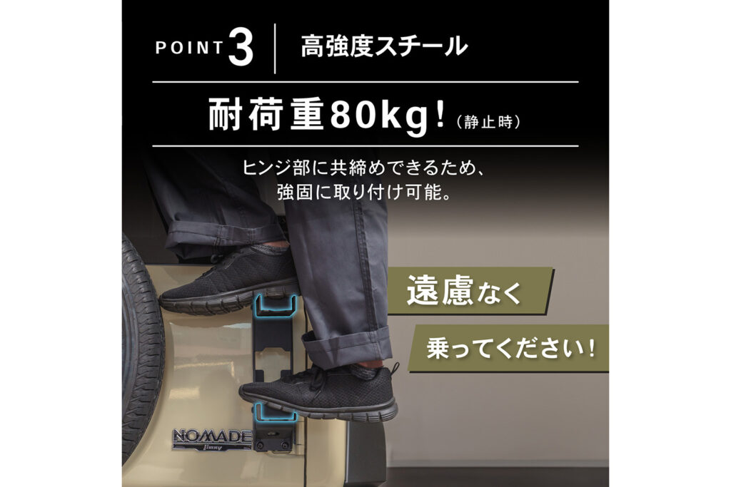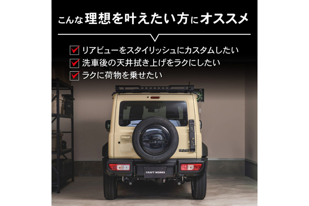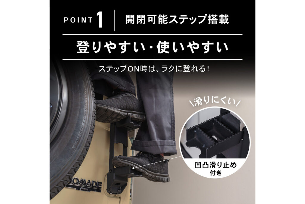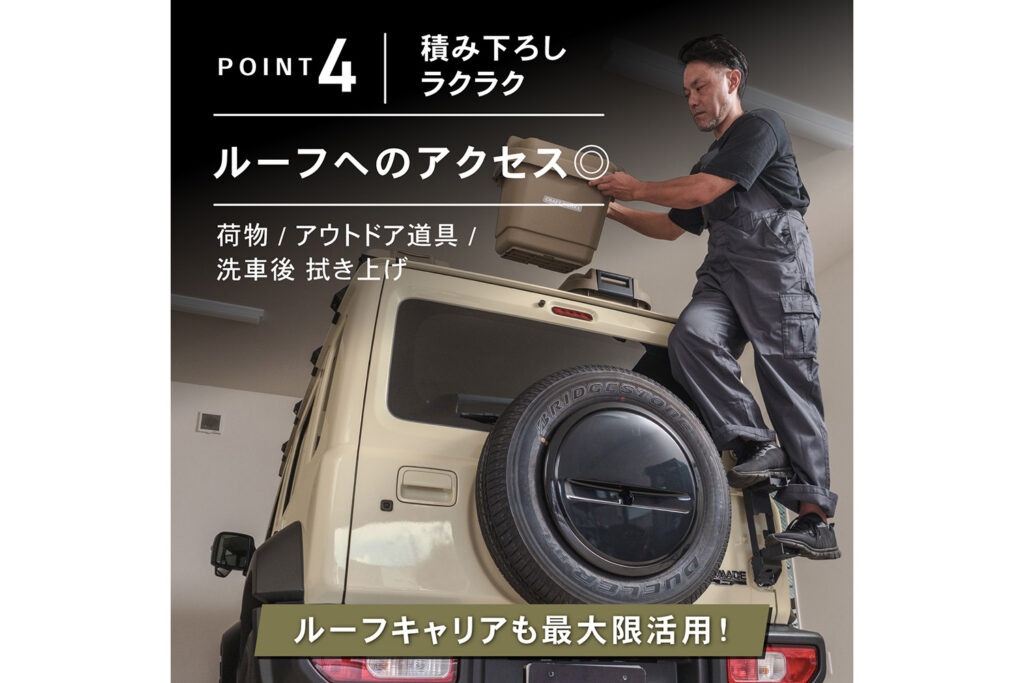 本製品は、ルーフキャリアへのアクセス性向上という実用的な機能に加え、「リアビューをスタイリッシュにカスタムしたい」というユーザーの要望に応えるデザイン性を追求。軽量で高剛性の構造、そして車体への穴あけ不要な強固な取り付け構造を採用することで、最新のジムニーノマドモデルを含む幅広いユーザーに、アウトドアから日常利用まで、快適で安全なカーライフを提供します。