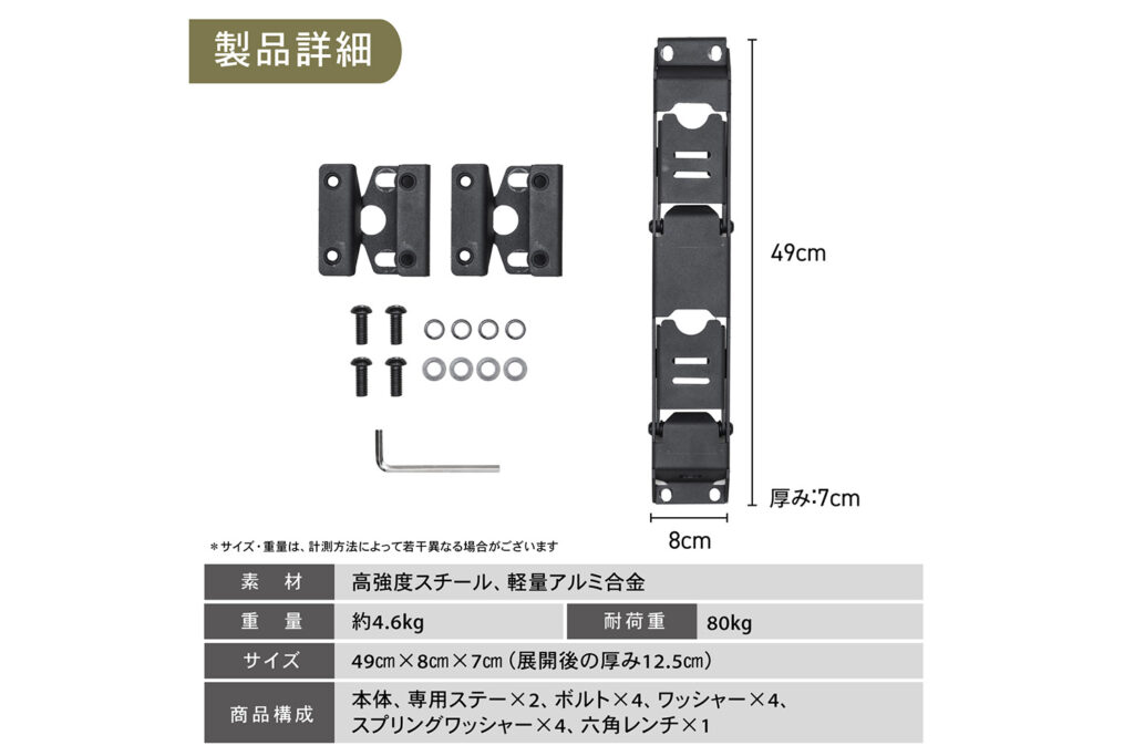 本製品は、見た目の美しさだけでなく、車両への強固な取り付けと高い安全性を最優先に設計されています。本体素材には高強度スチールと軽量アルミ合金を採用し、約4.6kgという軽量ながら高い剛性を実現。さらに、取り付けはリアゲートのヒンジ部に専用ステーを用いて共締めできる構造となっており、ルーフに昇降する際の安定性と安全性を確保します。