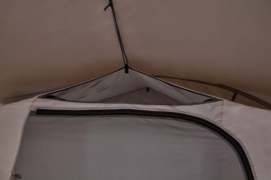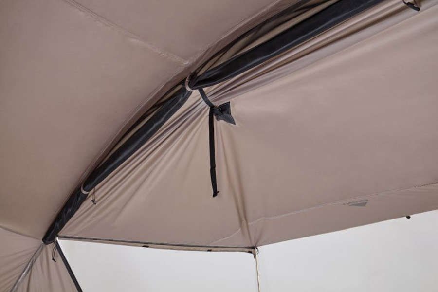 巻き上げたキャノピーをさらにバックルで止めることができる「ハイビューシステム」を採用。テント内からの景色が大きく広がるだけでなく、天井の 高さとリビングスペースも確保できます。