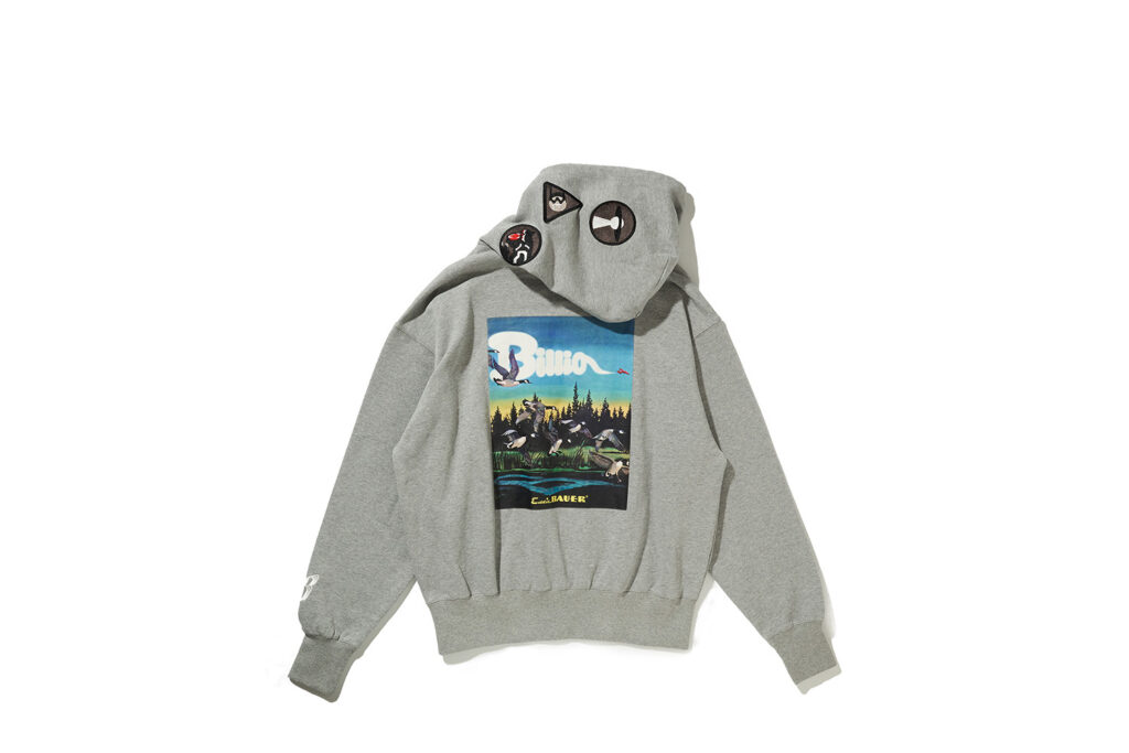 ストリート要素を強く押し出しているのが、COTTON HOODIE(コットンフーディ)です。バックに描かれたグースのグラフィックが魅力的であり、これはコラボ限定のグラフィックとして施されています。フードには刺繍ワッペン、前ポケットにはブランドネームパッチがあしらわれており、ディテールへのこだわりが感じられます。