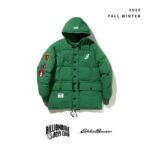 コレクションの主役となるのは、VINTAGE DOWN JACKET(ヴィンテージ ダウンジャケット)です。これは、エディー・バウアーの歴史を象徴する伝説のダウンパーカー「カラコラム」をベースにしており、BBCのオリジナルワッペンや刺繍が随所に施され、単なる復刻ではなく、コラボレーション限定のデザインへと昇華されています。