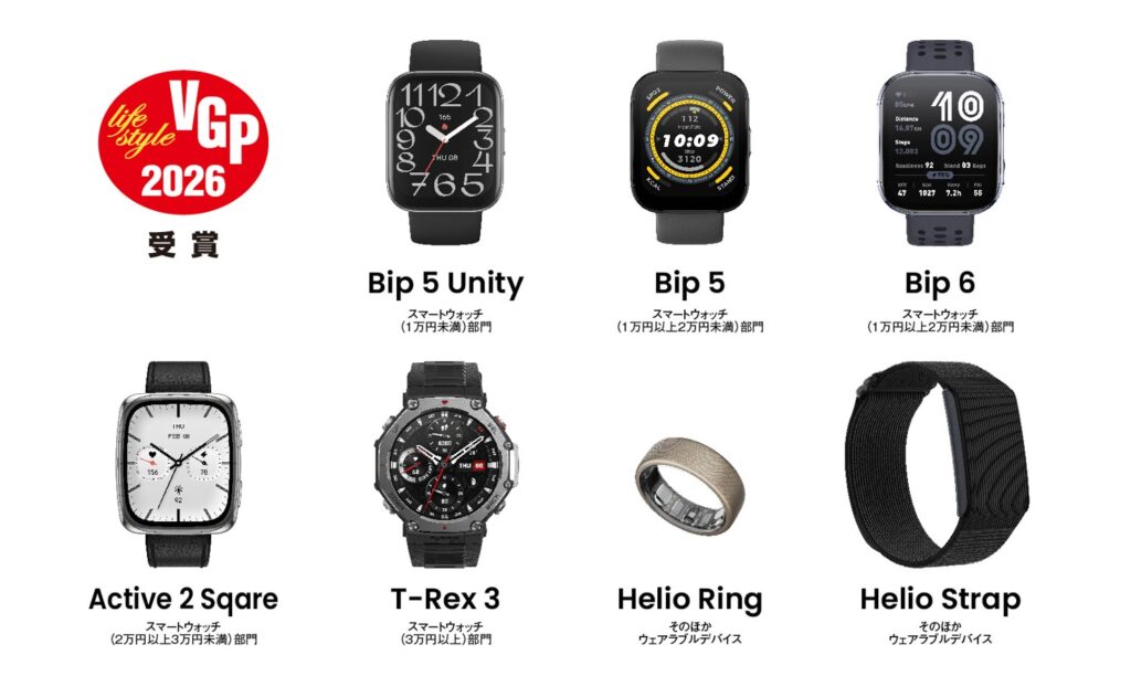 AmazfitブランドがVGP 2026で計10製品を受賞したことは、同社が提供する製品ラインナップの広さと品質の高さを示すものです。VGPアワードは、専門家と有力販売店が選定する信頼性の高い賞であり、以下の通り、Amazfitの製品が幅広い価格帯とカテゴリーで評価されました。