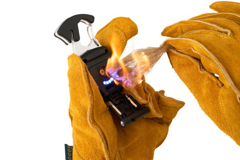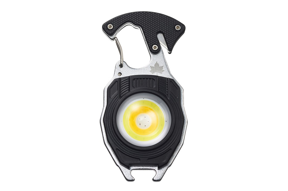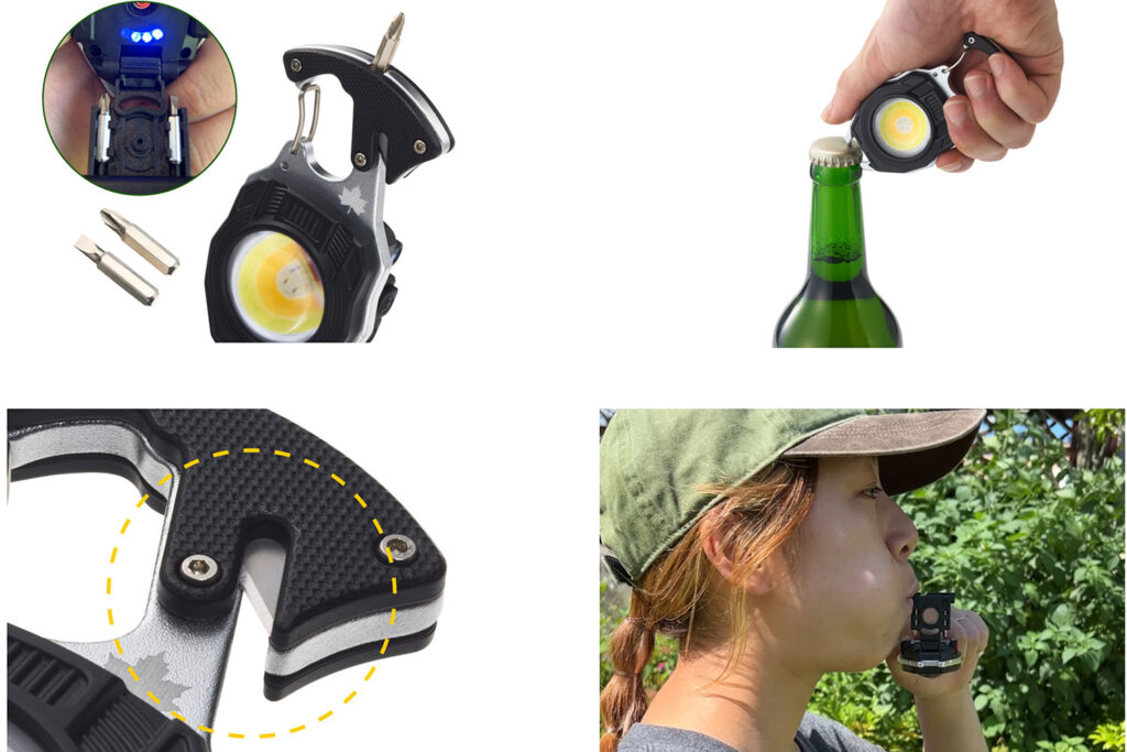 他にも、鋭いカッターはロープの切断やパッケージの開封、あるいは緊急時にシートベルトを裁断する必要がある場面でも活躍してくれる機能。キャンプで瓶ビールや瓶飲料を楽しむ際、意外と忘れがちなのが栓抜き機能も備わり、これが1つあるだけで、アウトドアの楽しみがグッと広がります。