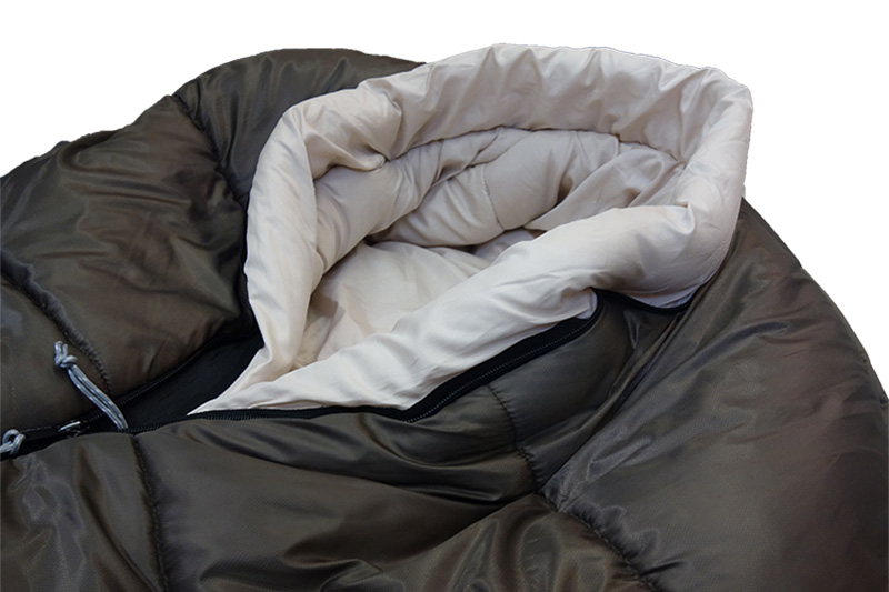 冬用寝袋を選ぶ際、スペック上の温度表記以上に重要なのが「隙間風(ドラフト)」をいかに防ぐかという点です。どんなに中綿が厚くても、首元や顔周りから冷気が侵入しては保温力は半減します。Bears Rockが特許を取得している「ドラフトフード」は、立ち上がる3D構造を採用。これにより、首・顔・頭のラインに沿って、ぴったりとフィット。まるで自宅の布団で顔までしっかり被っているような安心感を提供します。