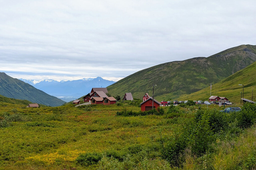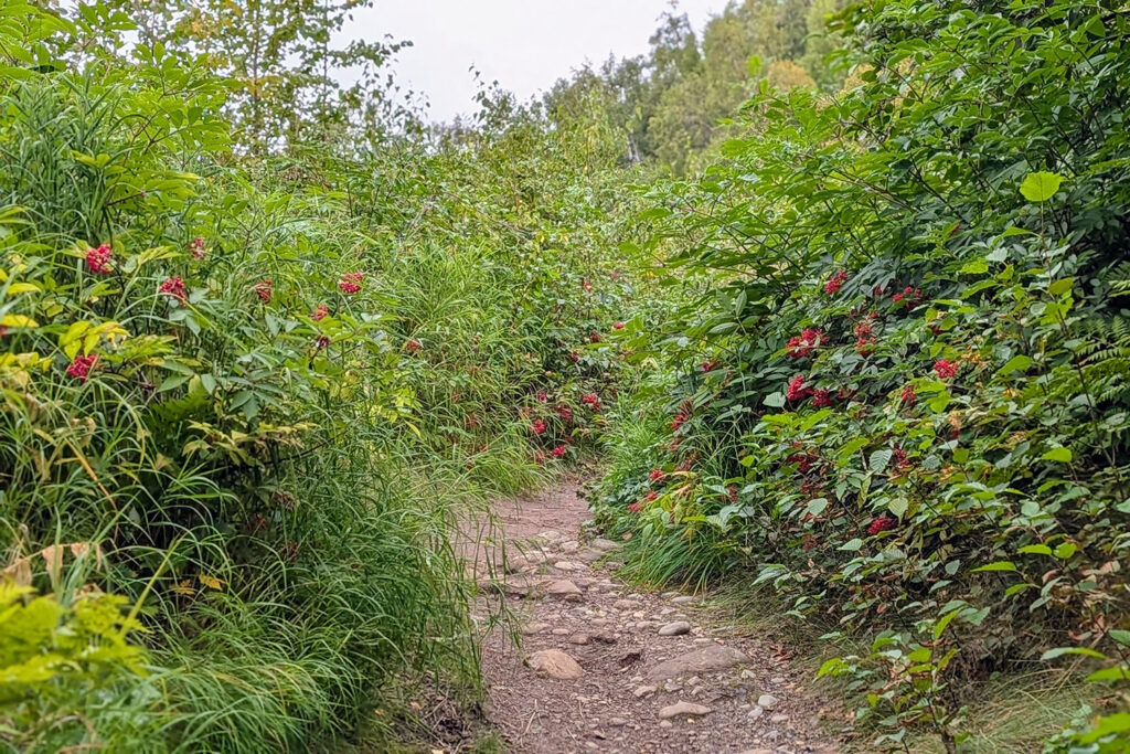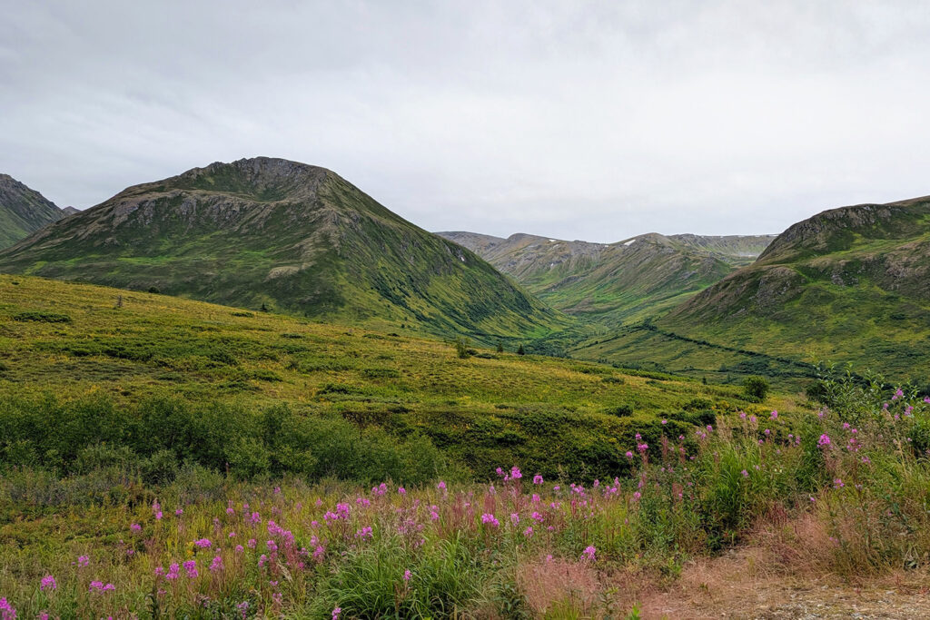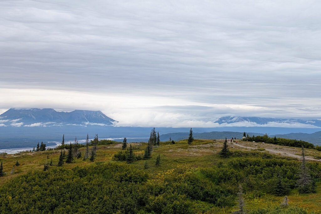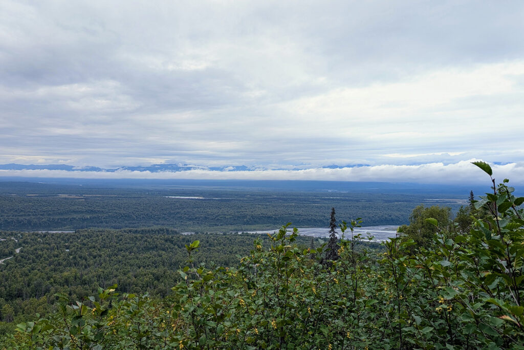 現地には3時間ほどで到着し、お目当ての「デナリ山を一望できる」というカリーリッジトレイルへ。シーズン終わりで人も少なく、シエラのトレイルよりも鬱蒼としてジャングルっぽかったため、「熊が出たら嫌だな……」と少し緊張しながら速足で尾根まで進みました。しかし、360度のパノラマビューが開けたポイントに到着したものの、空は分厚い雲に覆われ、デナリ山は全く見えませんでした。天候が良くなかったので期待はしていませんでしたが、やはり残念な気持ちになります。
