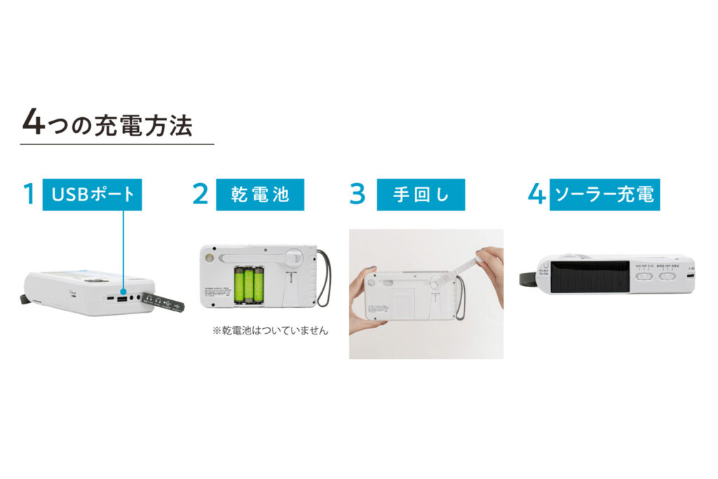 災害時、スマートフォンは安否確認や救助要請のための「命綱」であり、情報収集でバッテリーを消費してしまうのを防ぐため、本製品がサブ機として活躍します。 晴天時であれば太陽光で補充電が可能。乾電池が尽きた後の「最後の砦」となり、手回し発電により夜間や悪天候時でも、自力で電力を生み出すことができます。なお乾電池は入手しやすい単3電池3本で即時稼働が可能。AC充電(Type-C)による日常使いや急速充電にも対応。内蔵の2,000mAhバッテリーからスマートフォンへの給電も可能です。