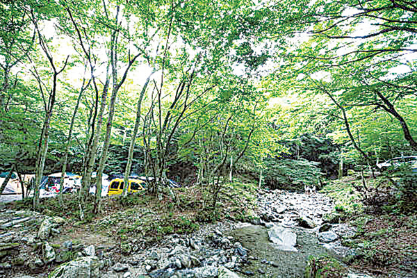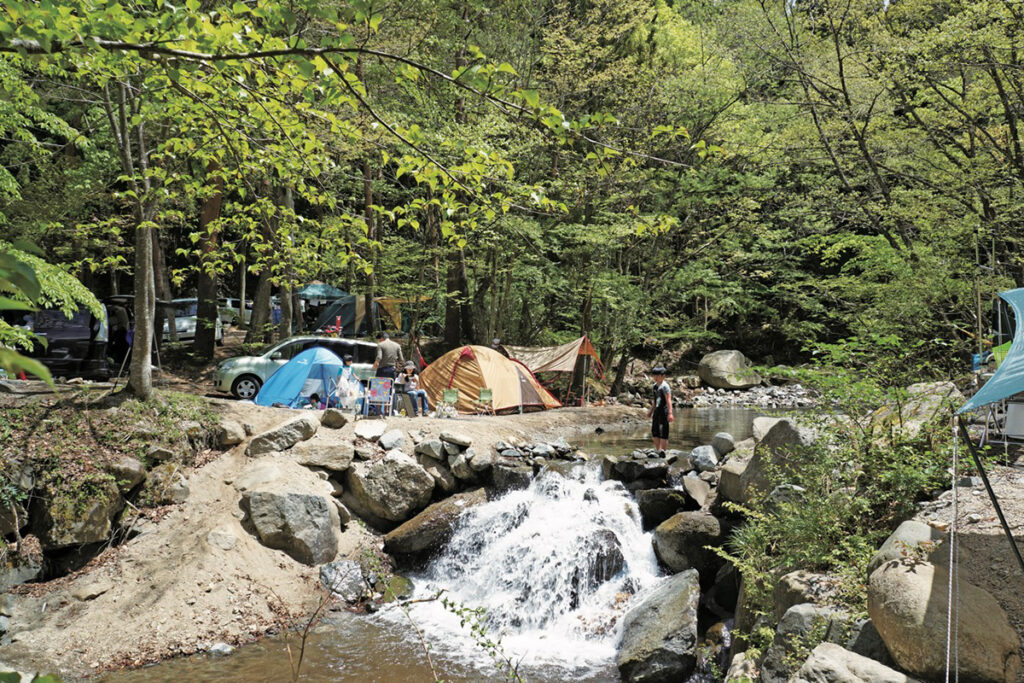 まずご紹介するのは「道志の森キャンプ場」です。同施設は、東京方面からも名古屋方面からもアクセスのよい好立地。周辺には道志の湯や石割の湯など、複数の温泉があります。こちらのキャンプサイトは、道志川の支流である三ヶ頼川沿いに広がる区画のないフリーサイト。清流沿い、林間、山の中など、どこでも好きな場所にテントを張ることができます。