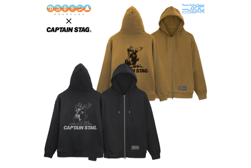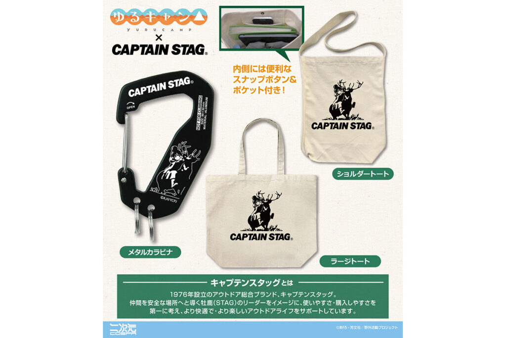 今回のアナウンスで最大の注目を集めているのが、アウトドアブランド『キャプテンスタッグ』とのコラボグッズです。ブランドのシンボルである「牡鹿(STAG)」のロゴ。仲間を安全な場所へ導くリーダーをイメージしたこの由緒あるロゴに、作品の主人公の一人・志摩リンがまたがるという、遊び心溢れる特別なデザインが誕生しました。